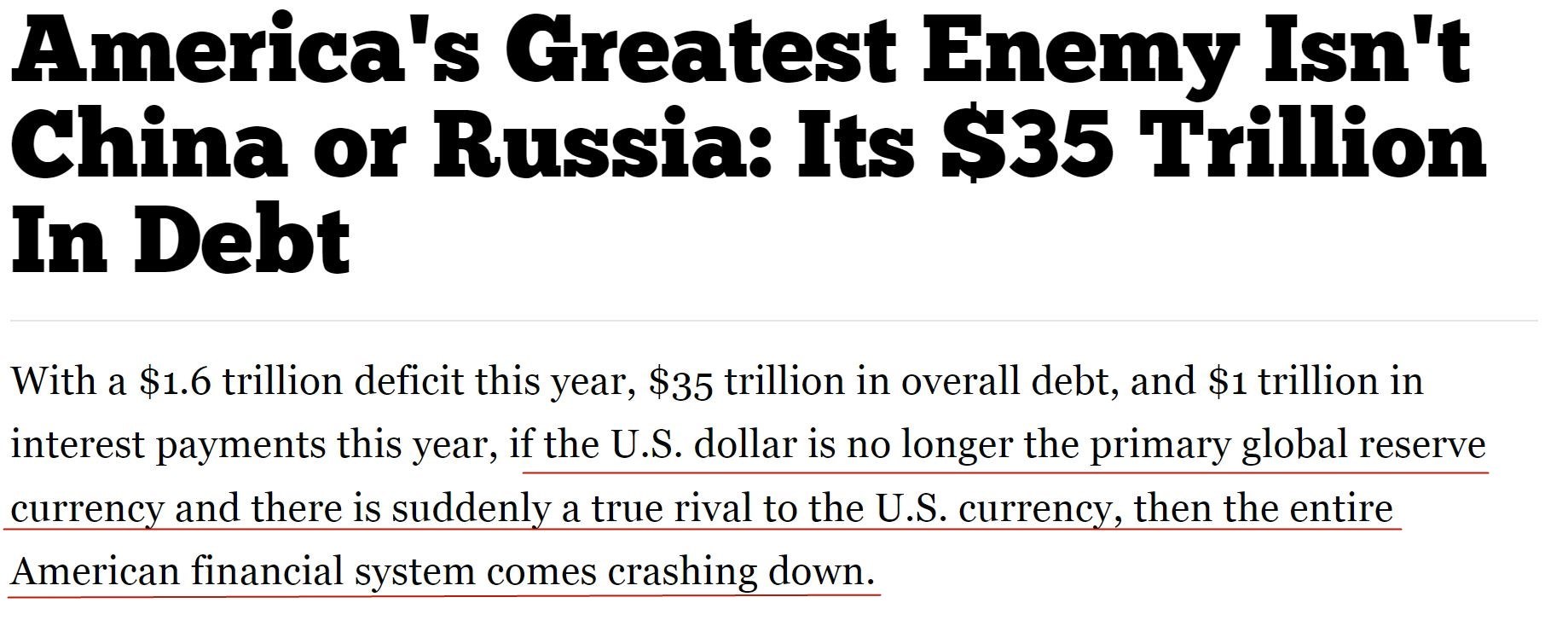 美国《国家利益》双月刊网站近日刊文认为,美国最大的“敌人”是其逼近35万亿美元的国债。文章说,世界其他国家,尤其是发展中国家,开始认识到美国经济的繁荣是不可持续的。一旦美元不再是世界主要储备货币,整个美国金融体系就会崩溃。债务是一场即将到来的国家安全危机。