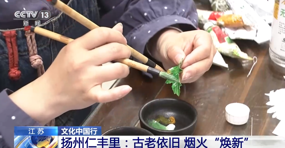 总台央视记者 杨威:将传统的非遗技能进行适合现代生活的活化式展现,是仁丰里非遗呈现的一大特色。像作为江苏省级非遗的扬州通草花制作技艺,已经有了超过两千年的历史,以前只是专攻于宫廷,如今在这里您可以近距离地观赏手艺人们现场制作的技巧,也可以亲自上手做一个属于自己的通草花带回家。