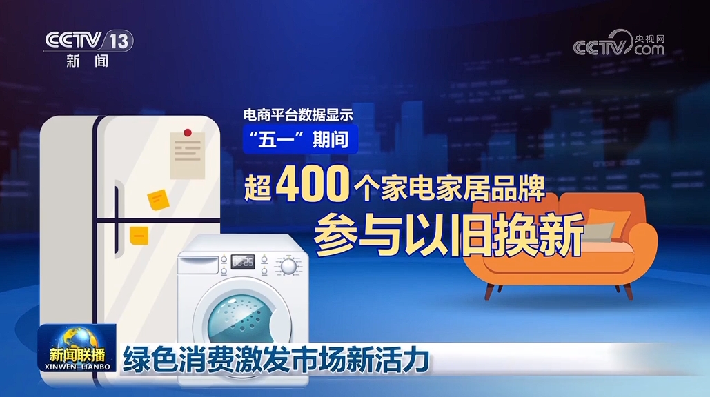 央视网消息(新闻联播):“五一”假期期间,节能家电家居产品、新能源车等绿色消费火热,激发市场新活力。