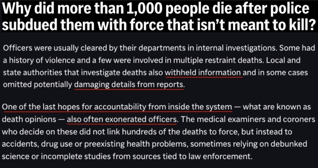 而作为内部问责的最后希望之一,法医和验尸官提供的所谓“死亡意见”也经常为警察开脱,一些明显与警察暴力执法相关的死亡,会被他们归因于事故、吸毒或先前存在的健康问题。
