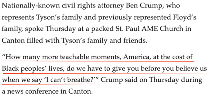 他在日前就此案召开的首次新闻发布会上悲愤质问:“美国啊,在我们说‘我无法呼吸’的时候,还要以多少非洲裔的生命为代价才能让你相信我们?”