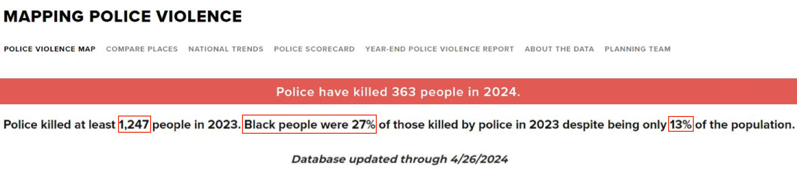 而今年截至4月26日最后一次数据更新,全美在不到四个月时间里已有363人命丧警察之手。