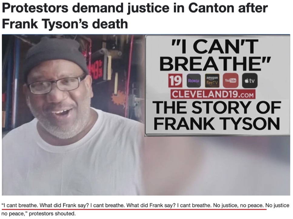 当地时间5日,美国俄亥俄州坎顿市的一个球场外,愤怒的抗议人群反复高呼这句话,强烈要求为日前遭白人警察“跪杀”的非洲裔男子弗兰克·泰森伸张正义。