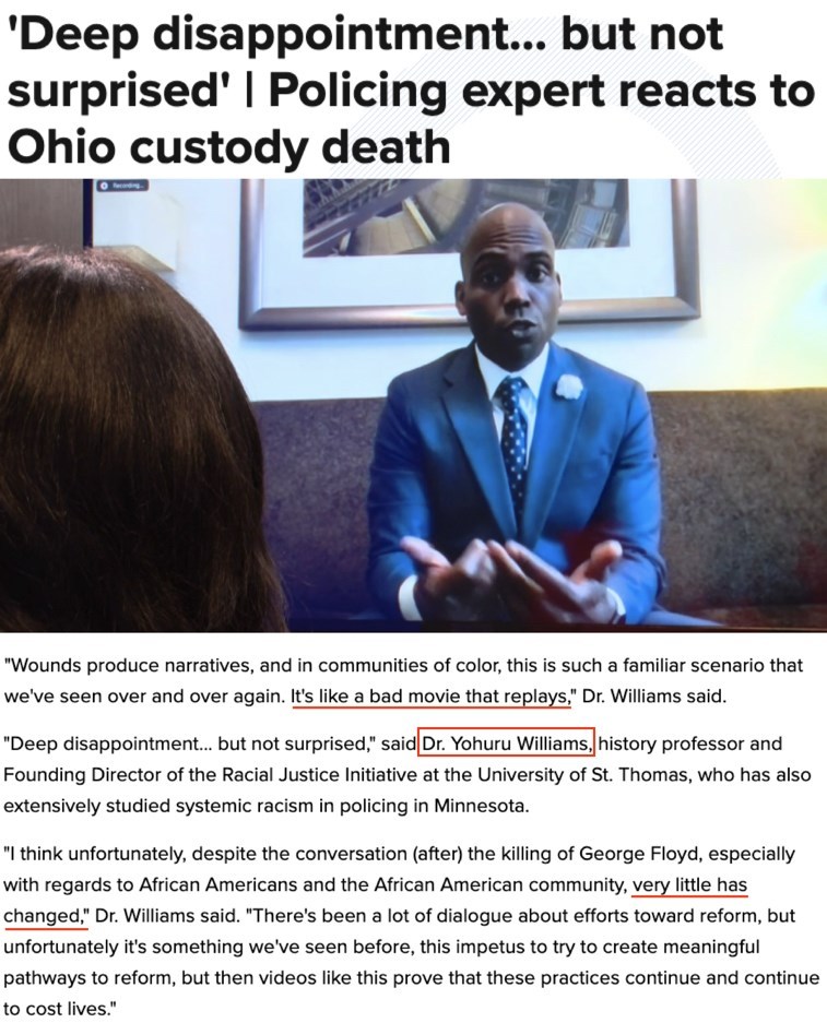 长期从事种族研究的美国圣托马斯大学历史学教授、该校种族正义计划发起人约胡鲁·威廉姆斯在接受采访时表示,他对泰森遇害深感失望,但并不惊讶。