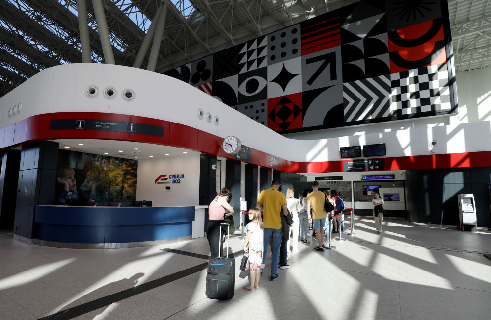 4月29日,在塞尔维亚贝尔格莱德中央火车站,人们在排队购买车票。新华社记者李颖摄