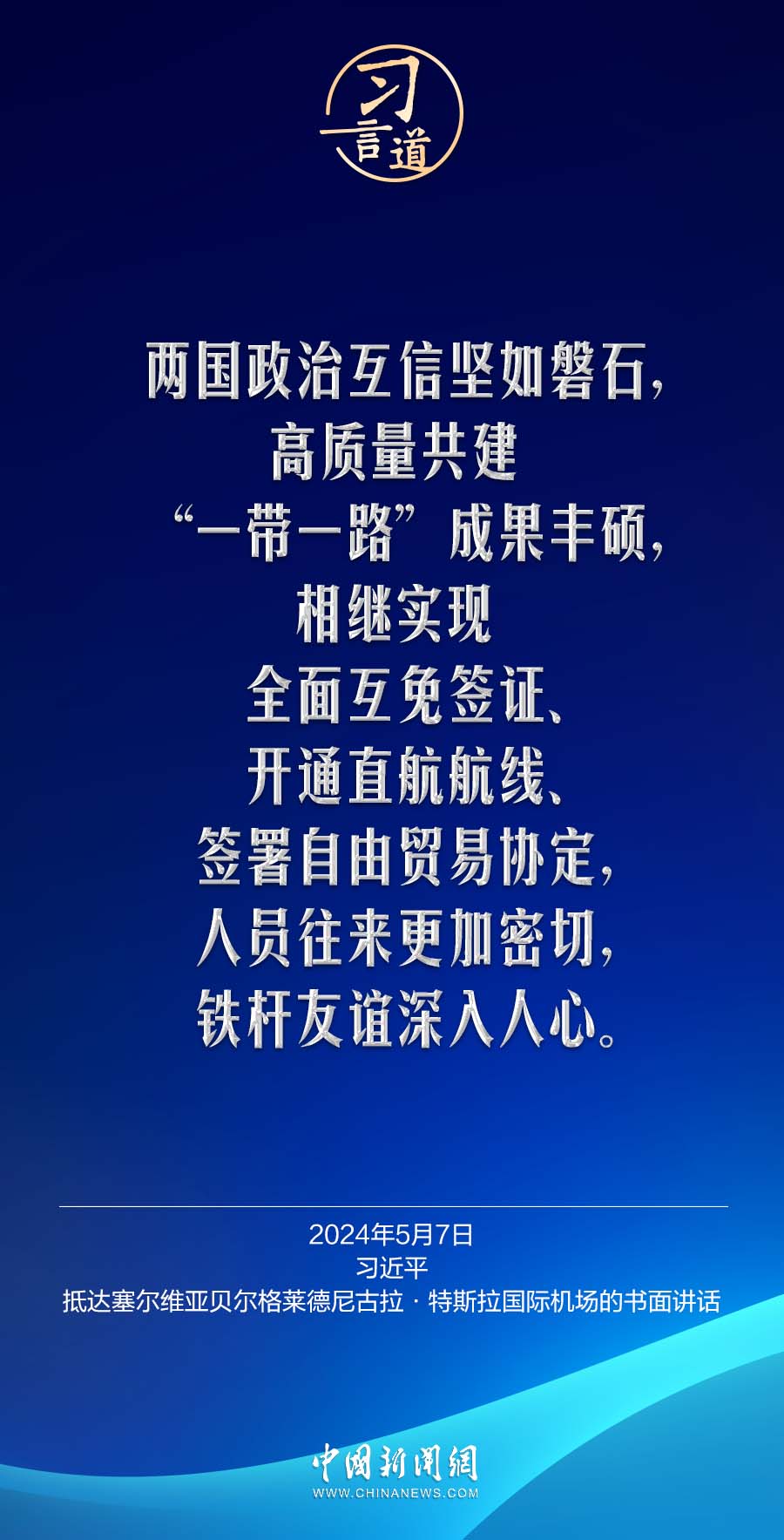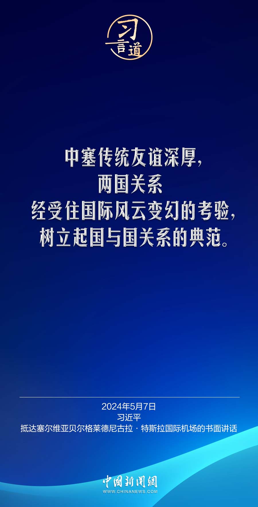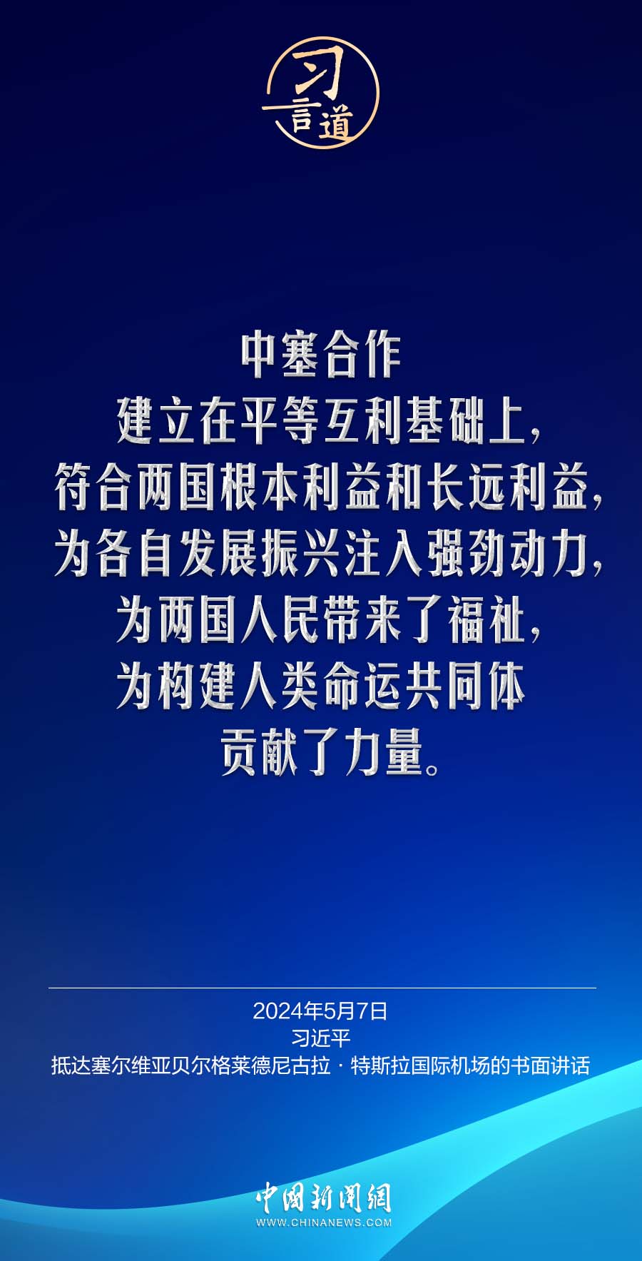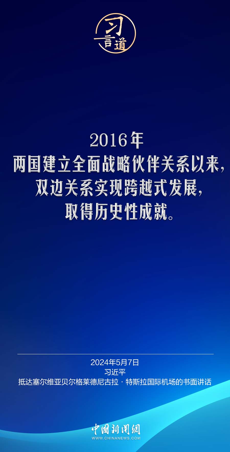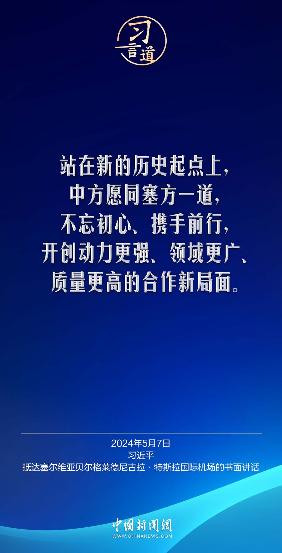 当地时间5月7日晚,国家主席习近平乘专机抵达贝尔格莱德,应塞尔维亚总统武契奇邀请,对塞尔维亚进行国事访问。在抵达后的书面讲话中,习近平指出——
