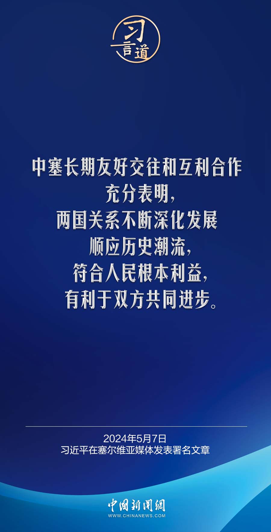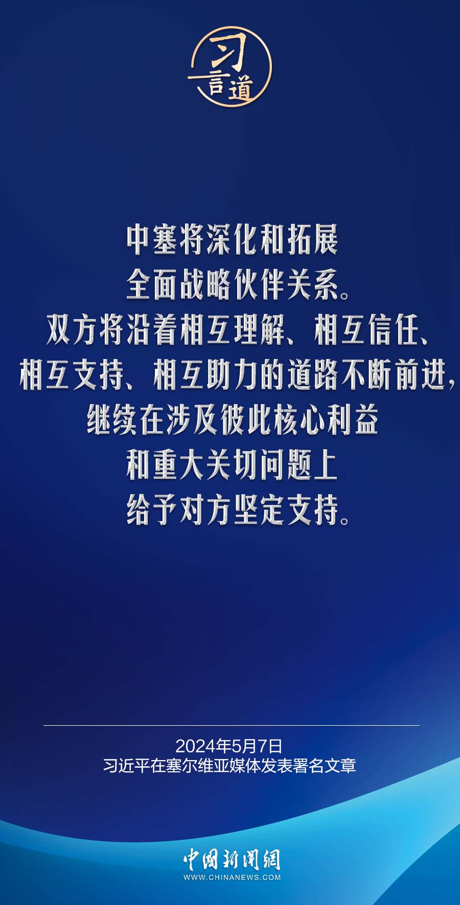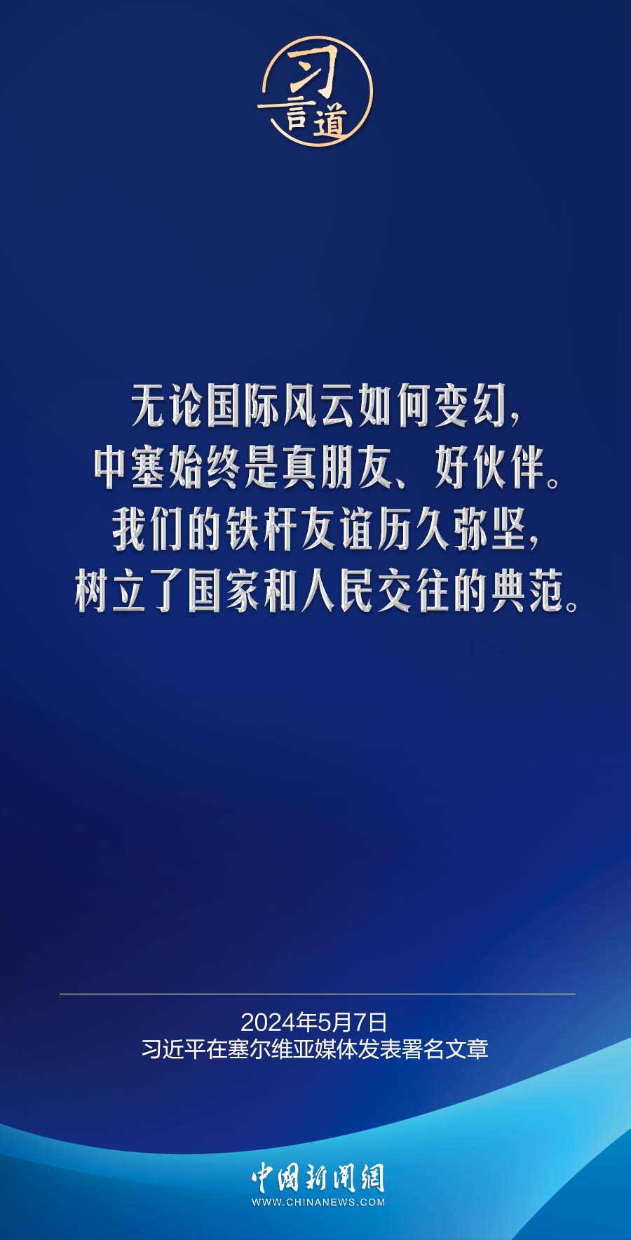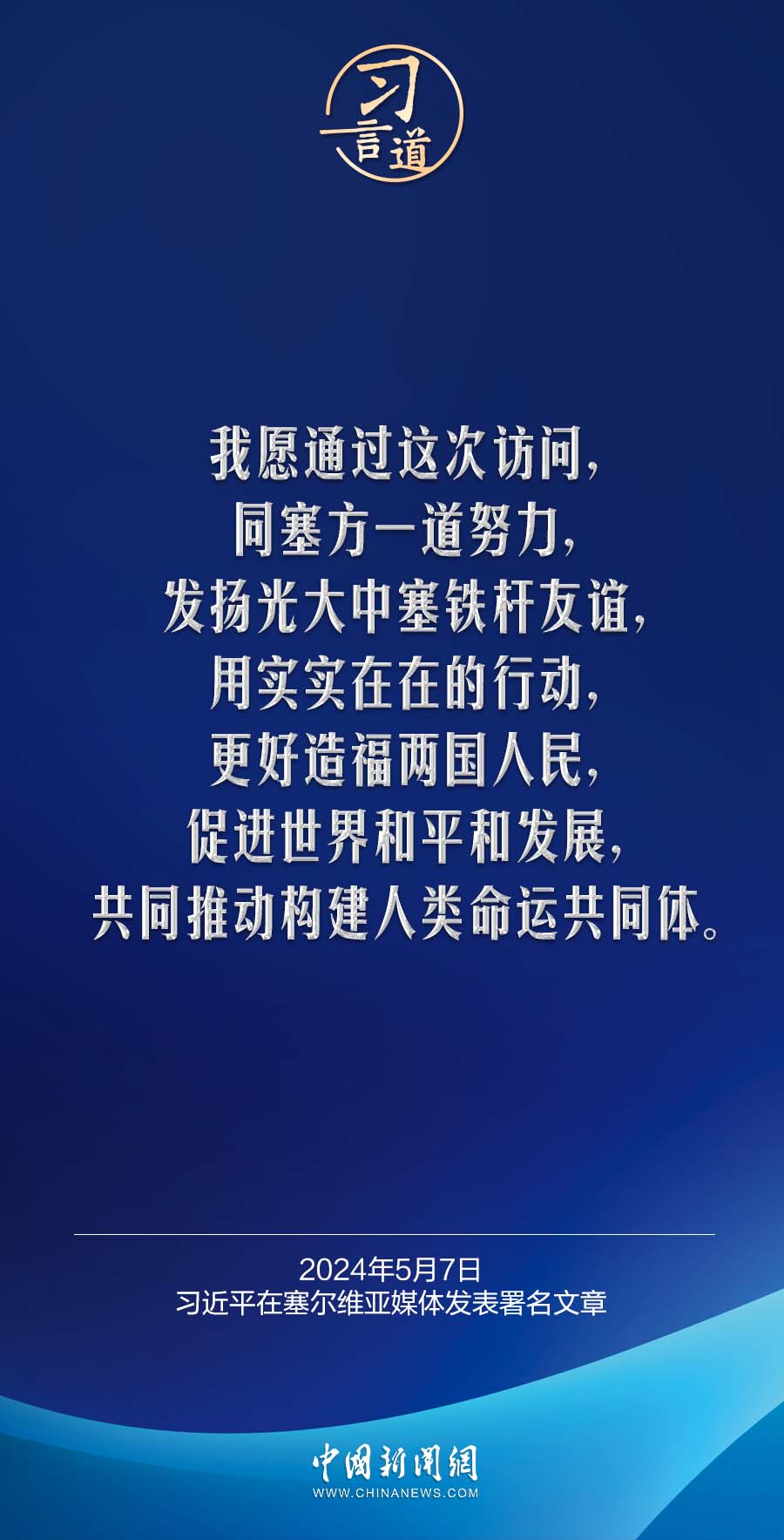 5月7日,在赴贝尔格莱德对塞尔维亚进行国事访问之际,国家主席习近平在塞尔维亚《政治报》发表题为《让铁杆友谊之光照亮中塞合作之路》的署名文章。习近平指出——