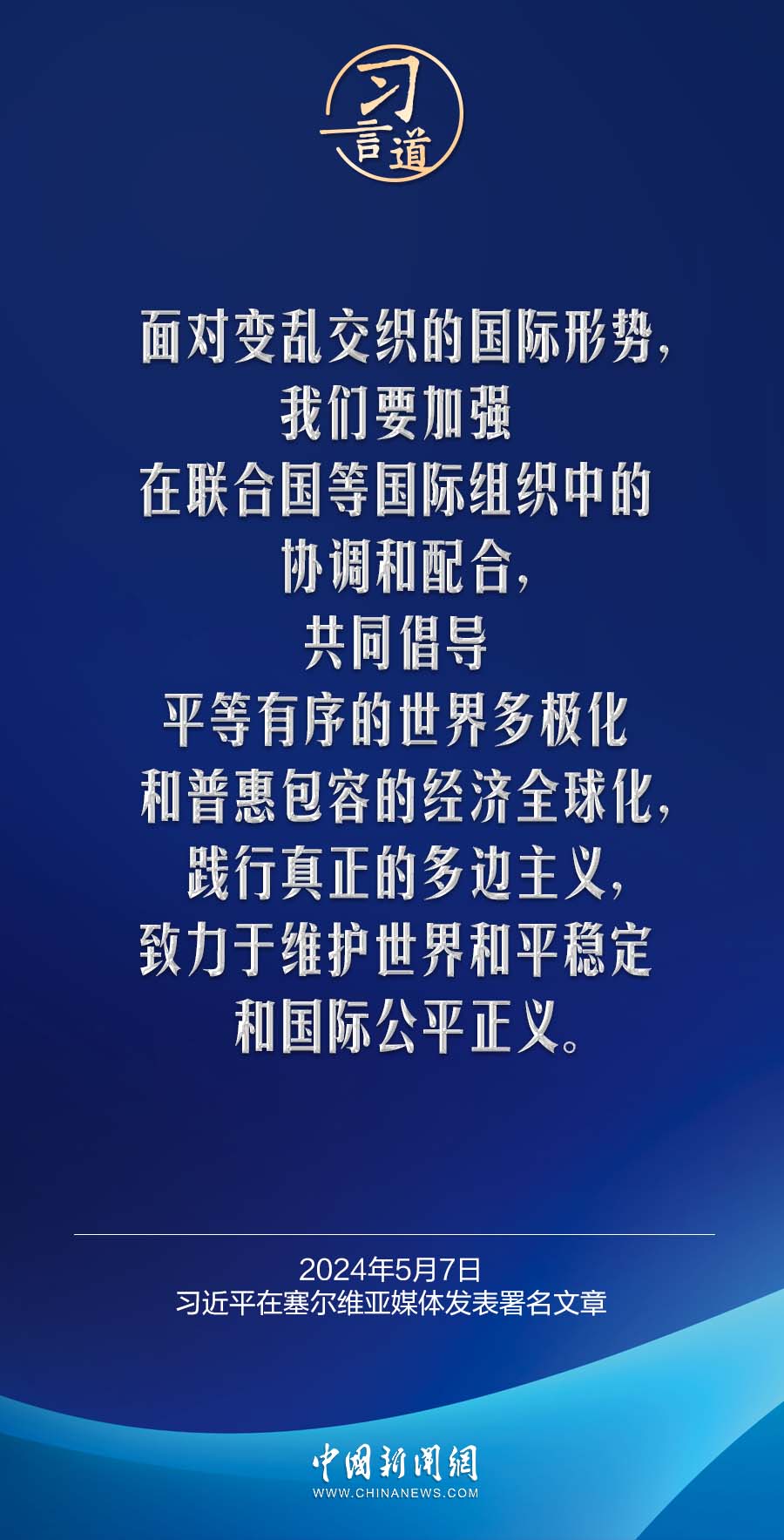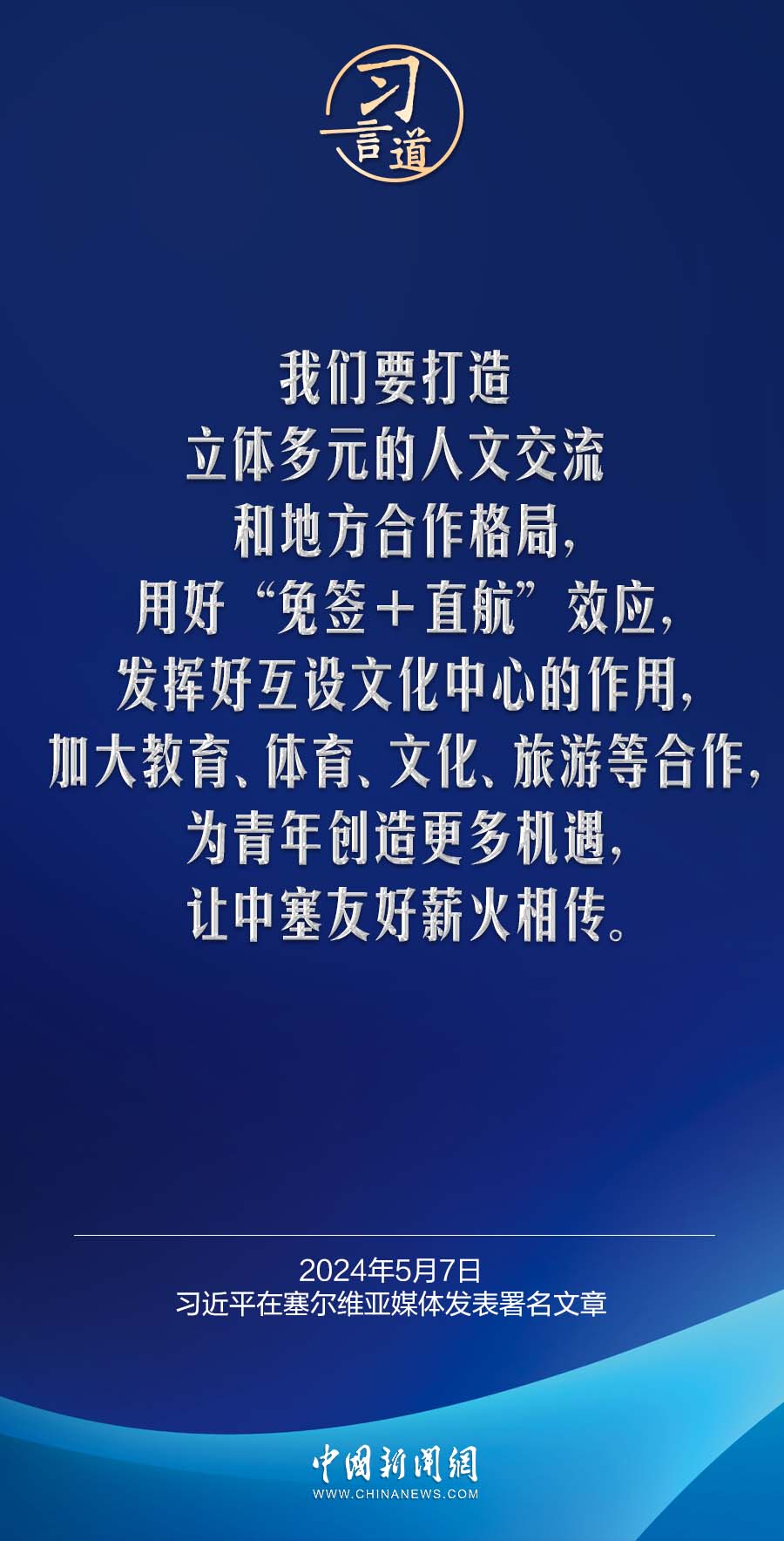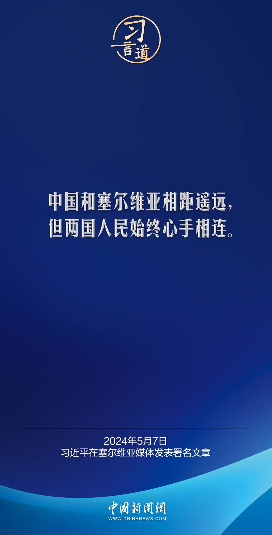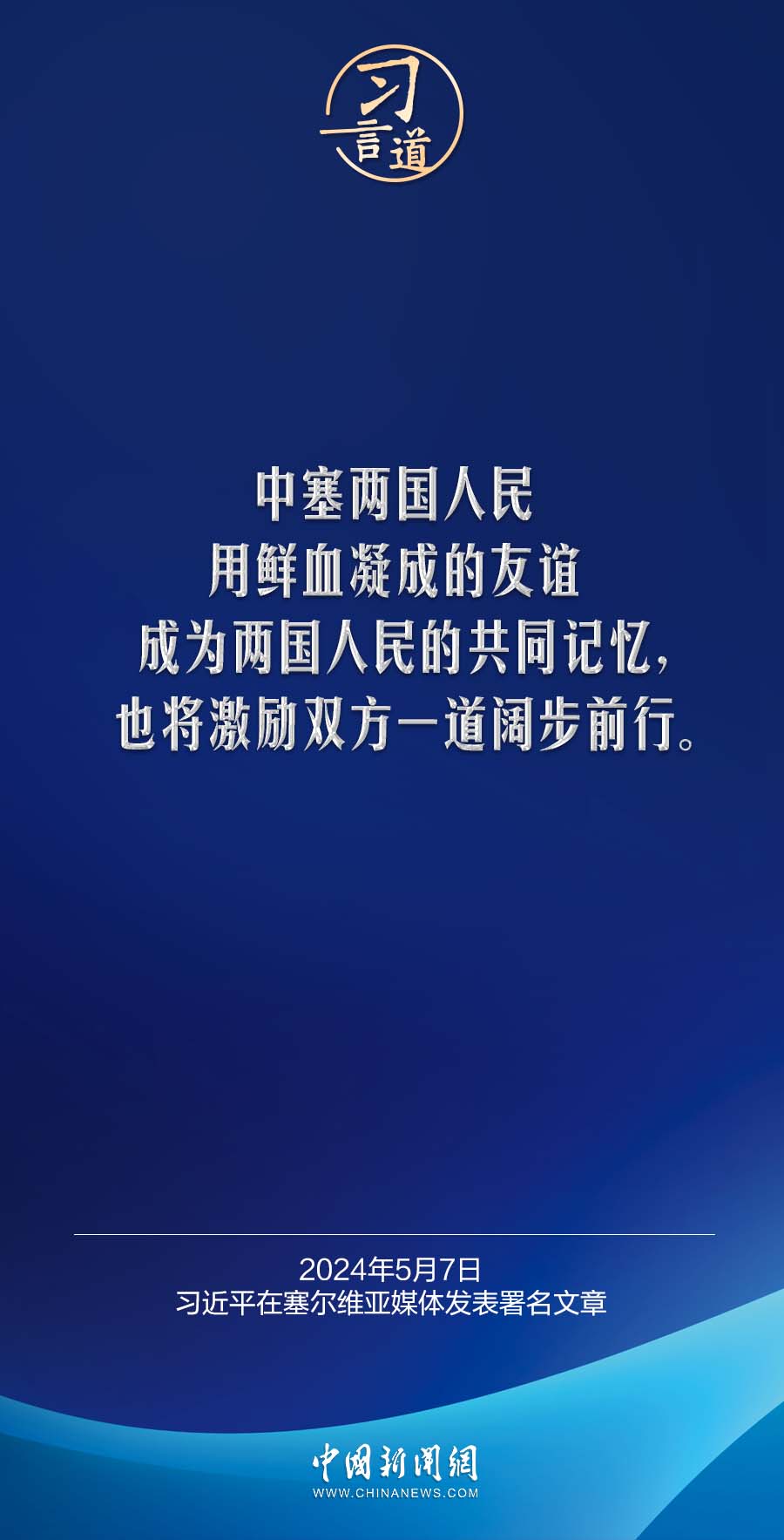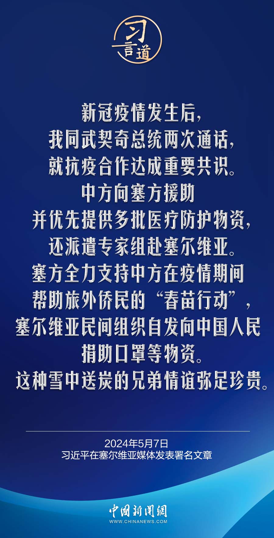 5月7日,在赴贝尔格莱德对塞尔维亚进行国事访问之际,国家主席习近平在塞尔维亚《政治报》发表题为《让铁杆友谊之光照亮中塞合作之路》的署名文章。习近平指出——