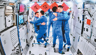4月26日在轨执行任务的神舟十七号航天员乘组顺利打开“家门”,欢迎远道而来的神舟十八号航天员乘组入驻“天宫”。新华社记者 金良快摄