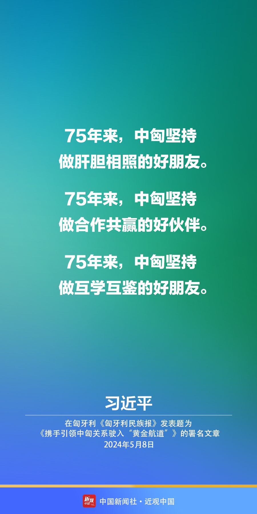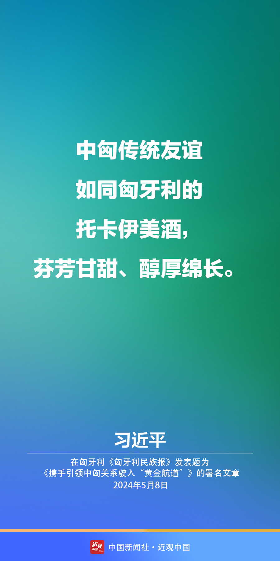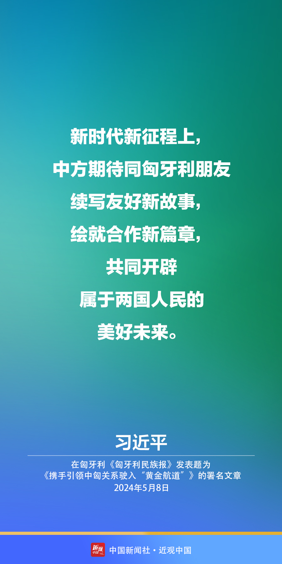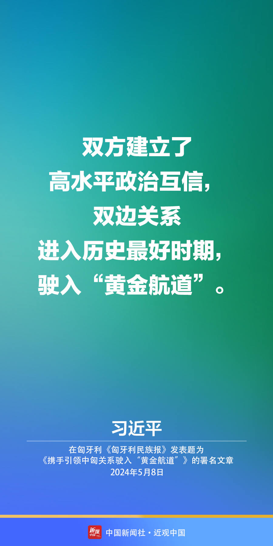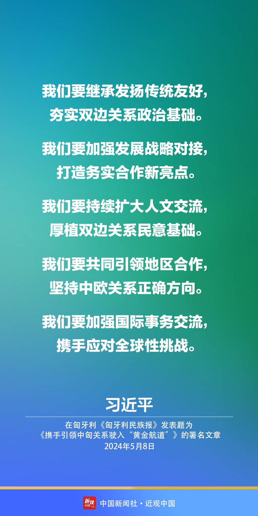 5月8日,在赴布达佩斯对匈牙利进行国事访问之际,国家主席习近平在匈牙利《匈牙利民族报》发表题为《携手引领中匈关系驶入“黄金航道”》的署名文章。习近平指出——