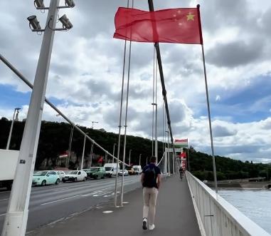 当地时间5月7日,为迎接习近平主席到访,匈牙利首都布达佩斯的地标建筑及交通要道多瑙河伊丽莎白桥上挂起了中匈两国的国旗。图片来源:中新网视频截图