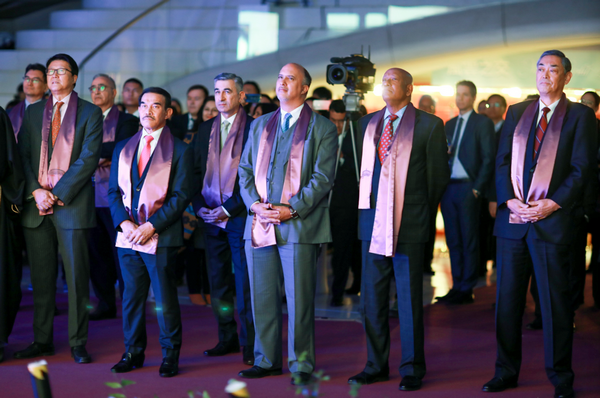 各國使節及嘉賓們親臨鳳凰中心,登上具有時空交疊之感的“夢之橋”,欣賞沿途具有中華文化韻味的古箏和現代舞表演。嘉賓們還饒有興致地觀看了《風雲之交》圖片展,並拿起毛筆,共同描繪了“風雲之交”四個大字,慶賀曉田新書的發佈。