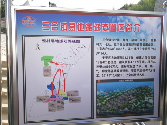 三合镇邦业隆、翻身、窑洞、索尔干、庄科村六、七社均属脑山村,交通不便、信息闭塞、经济落后,村落地理条件差。为彻底解决以上村庄就医难、上学难、娶妻难、增收难、住房难等“六难”问题,区委区政府在充分调研和广泛征求群众意愿的基础上,积极探索精准扶贫易地搬迁新模式,对以上四村两社村民采取“离山下川、进镇上楼”方式,在三合集镇统一规划建设易地搬迁集中安置区,实现贫困群众“挪穷窝、拔穷根”。