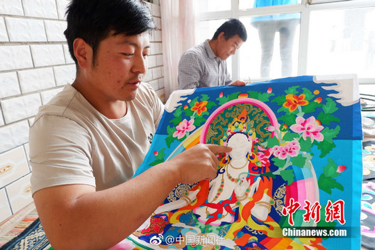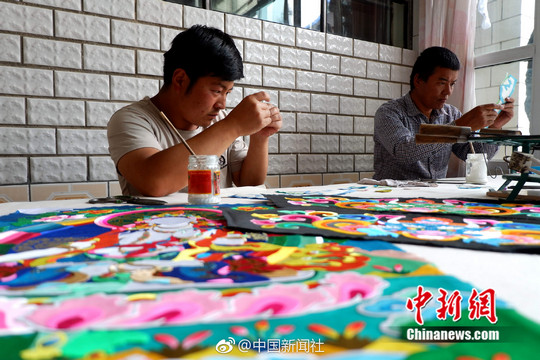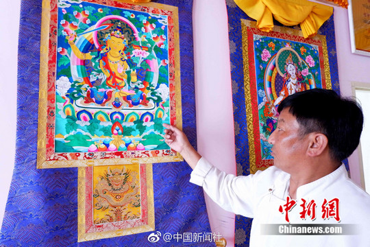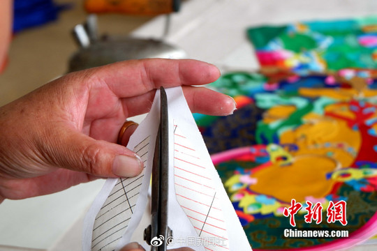 【指尖神韵!布条“堆”的这么美,你见过吗?】布条在日常生活中是不起眼的琐碎之物,但在青海省黄南藏族自治州同仁县的藏族民众手中,布条可是“宝贝”,用它“堆”出来的唐卡——堆绣唐卡可是稀罕物。堆绣是用各色棉布、绸、缎剪成所设计的各种图案形状,精心堆贴成一个完整的画面,然后用彩线绣制而成。通过打底稿、剪裁、堆贴、绣制,个别图案部分上色等工序堆贴、绣制而成。题材多以佛经故事为主,兼有花鸟、山水、人物,色彩艳丽,工艺考究,深受海内外人士青睐。(中新社青海分社记者李隽)