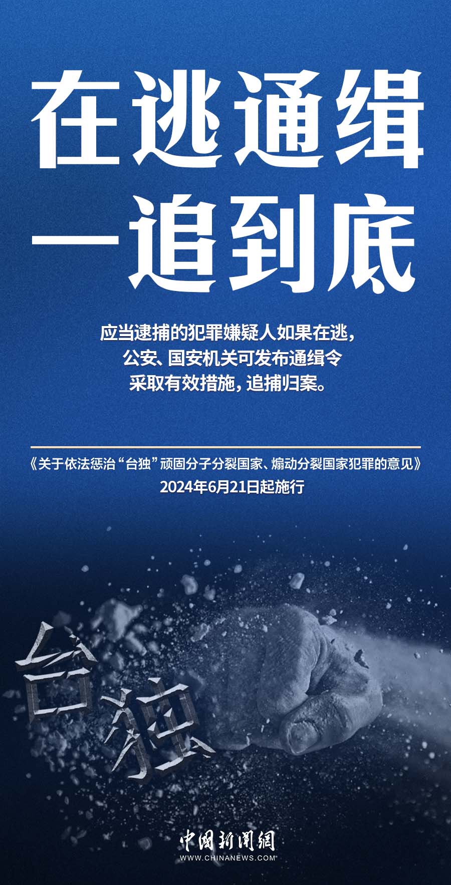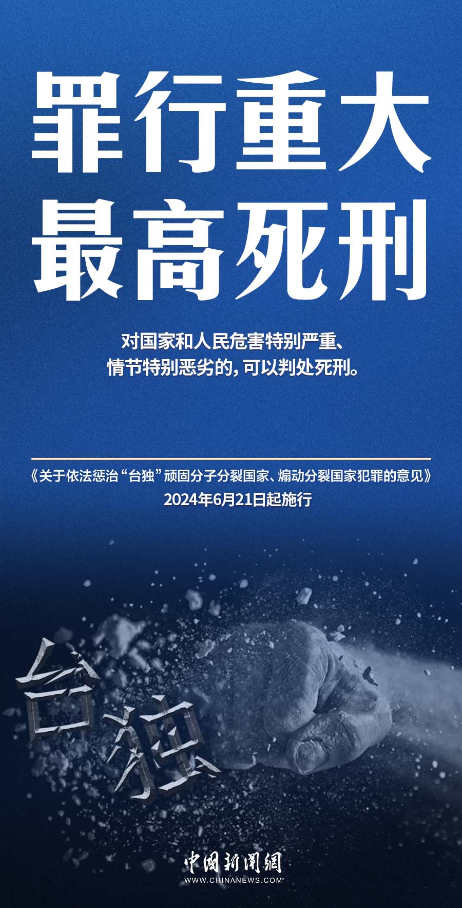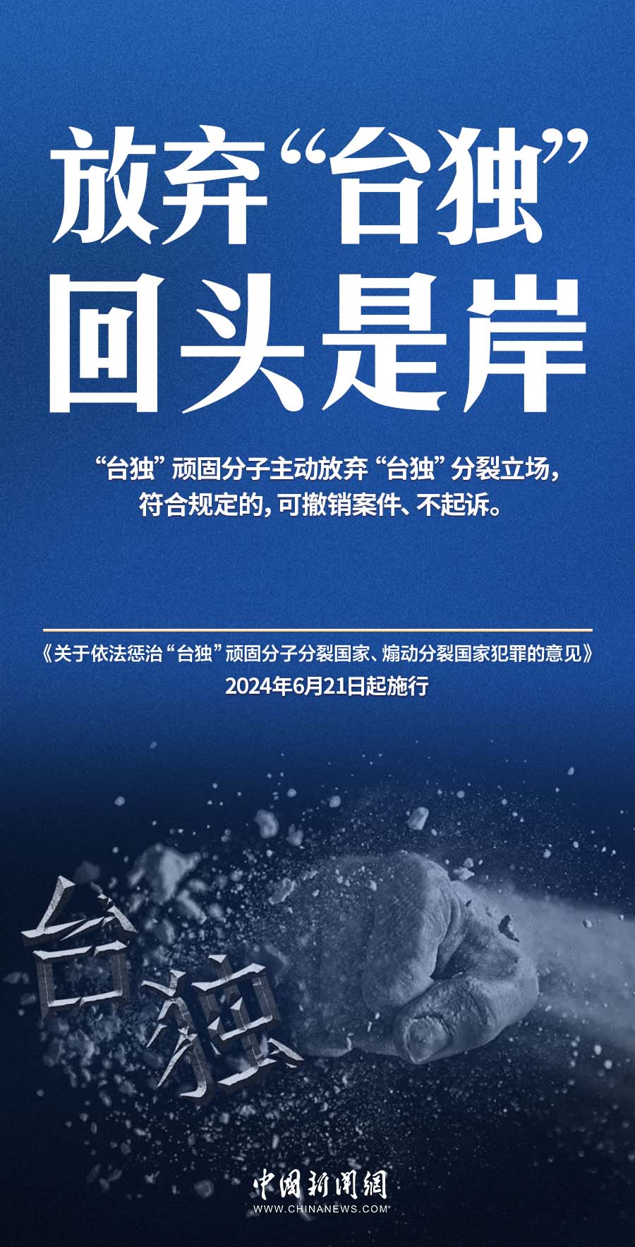 6月21日,最高人民法院、最高人民检察院、公安部、国家安全部、司法部联合发布《关于依法惩治“台独”顽固分子分裂国家、煽动分裂国家犯罪的意见》,自发布之日起施行。