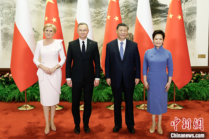 6月24日下午,中国国家主席习近平在北京人民大会堂同来华进行国事访问的波兰总统杜达举行会谈。会谈前,习近平和夫人彭丽媛同杜达和夫人阿加塔合影。 中新社记者 盛佳鹏 摄