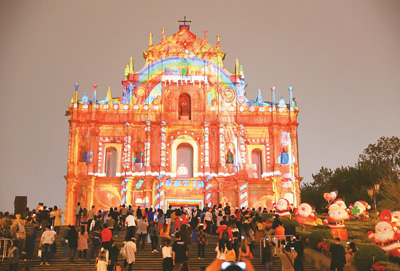 12月19日,澳门大三巴牌坊举行光雕表演活动,吸引众多市民和游客驻足欣赏,感受澳门回归祖国20周年的喜庆氛围。 本报记者 张 盼摄