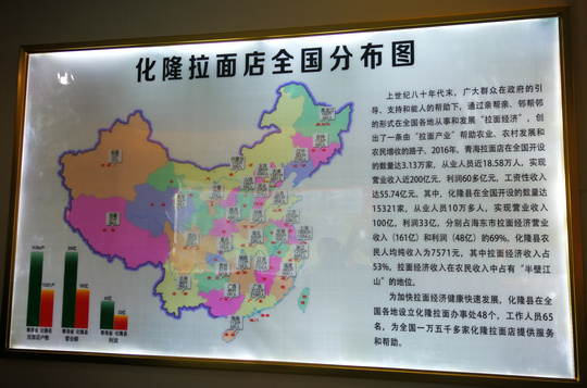 如今,以化隆人为主的“拉面大军”,以数以万计的“拉面馆”为载体,将“牛肉拉面”从“面文化”的发源地“拉”向全国,足迹遍布北京、上海、天津、广州、深圳、厦门等沿海内地的大城市,一个个“化隆牛肉拉面”馆犹如雨后春笋般在这些城市中落地生根,开花结果。有的还走出国门,发展到印度尼西亚、菲律宾、新加坡、德国、日本等十多个国家,打造出了富有民族特色的劳务品牌“化隆牛肉拉面”。