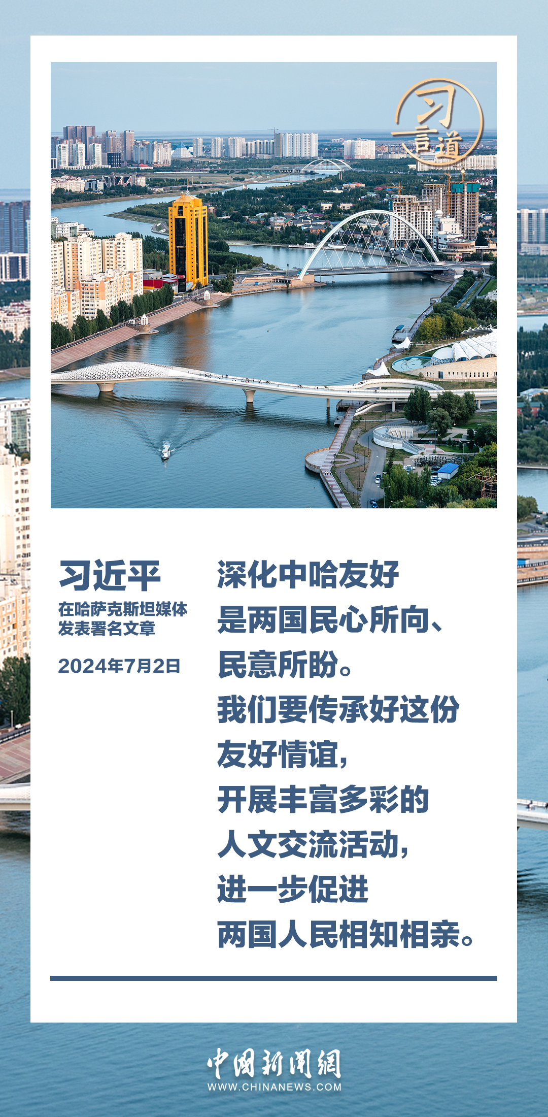 7月2日,在赴阿斯塔纳对哈萨克斯坦进行国事访问之际,国家主席习近平在《哈萨克斯坦真理报》、哈萨克国际通讯社发表题为《同心笃行 续写中哈关系新篇章》的署名文章。习近平指出——