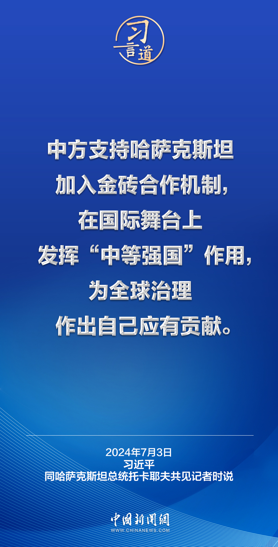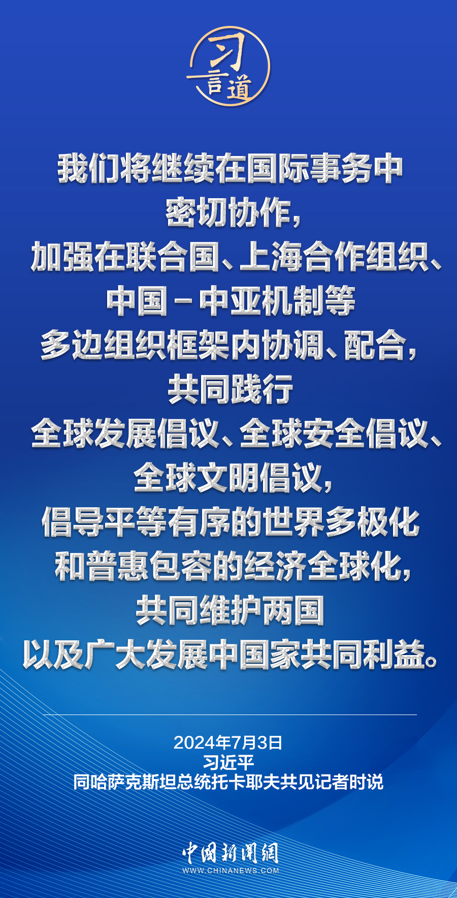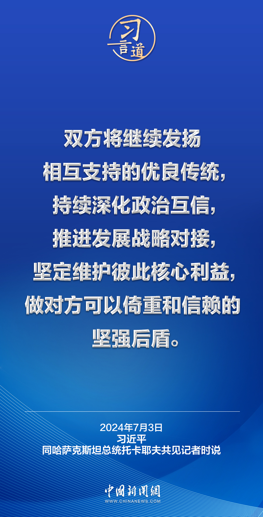 当地时间7月3日,国家主席习近平在阿斯塔纳总统府同哈萨克斯坦总统托卡耶夫会谈后共同会见记者。习近平指出——