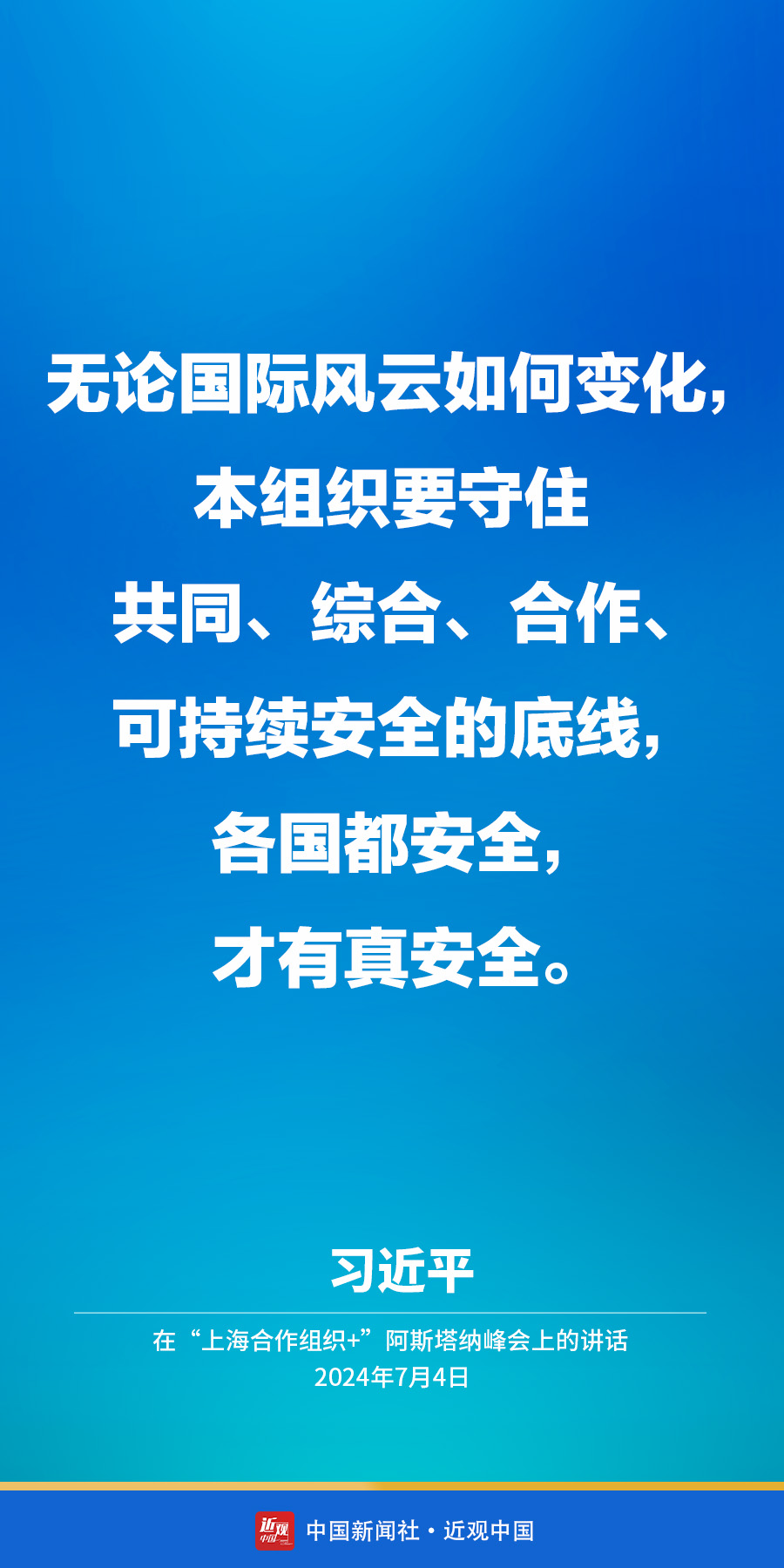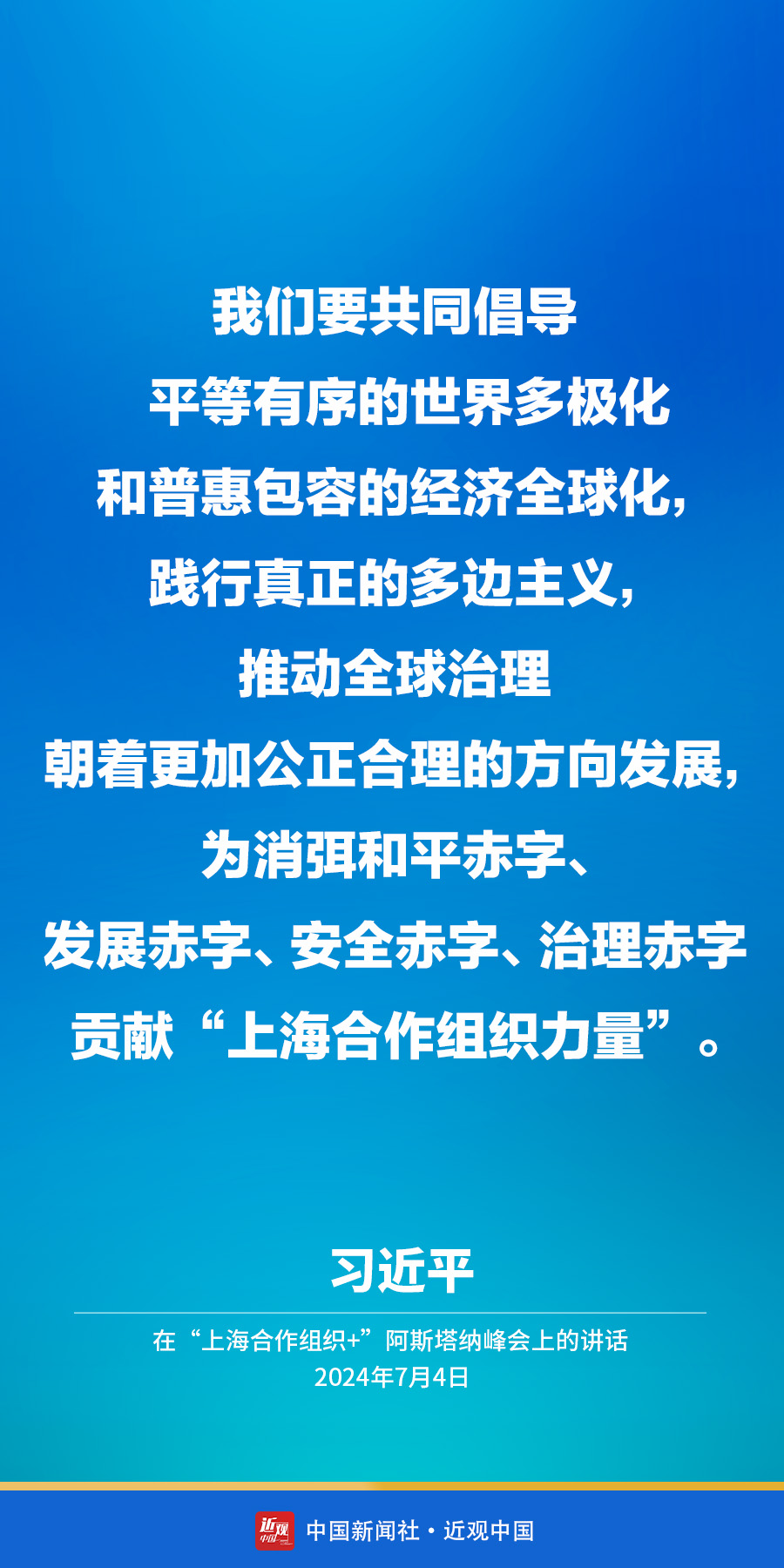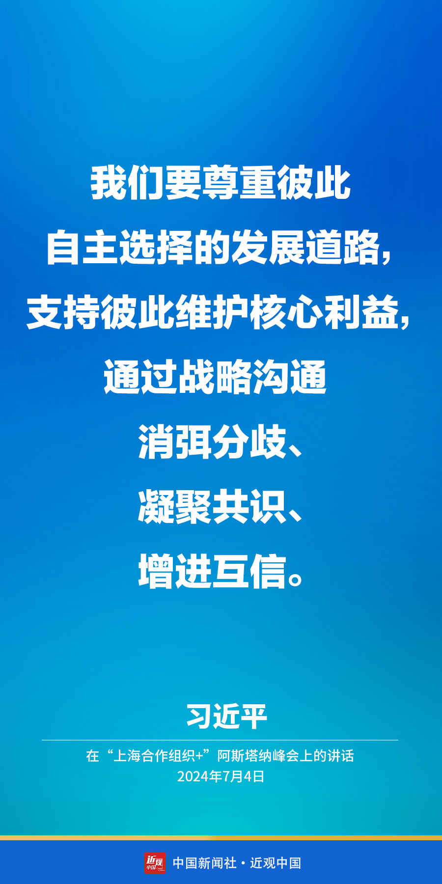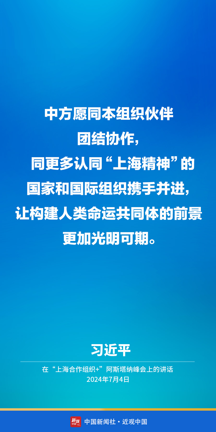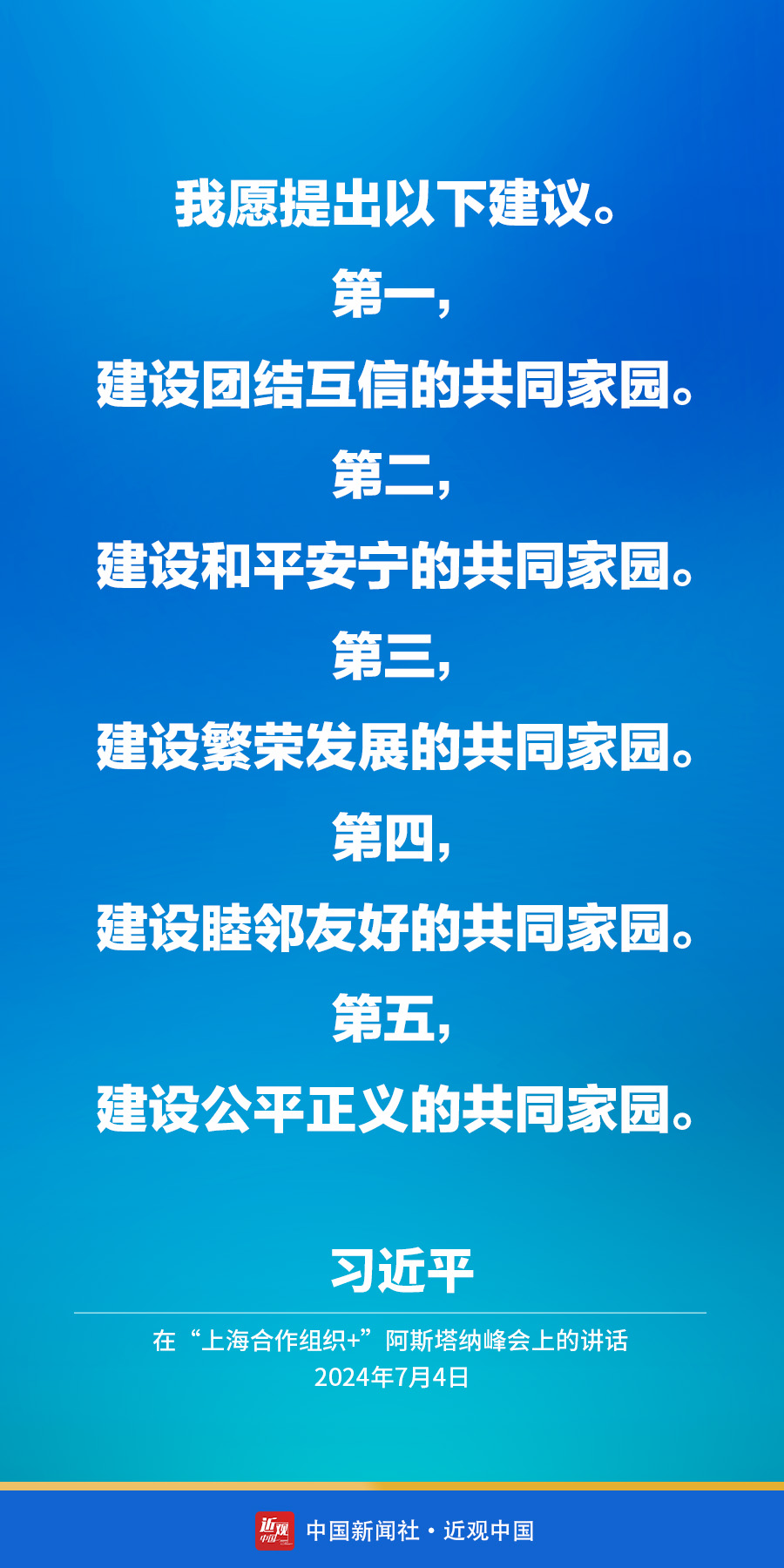 当地时间7月4日下午,国家主席习近平在阿斯塔纳出席“上海合作组织+”阿斯塔纳峰会并发表题为《携手构建更加美好的上海合作组织家园》的重要讲话。他在讲话中指出——