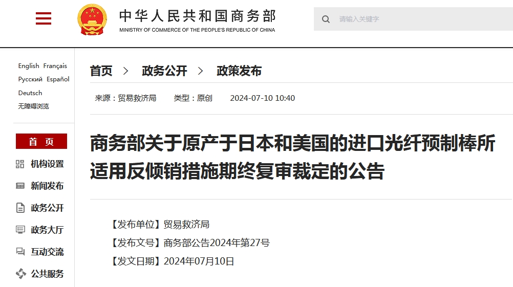 2023年7月10日,应中国光纤预制棒产业申请,商务部发布2023年第24号公告,决定自2023年7月11日起,对原产于日本和美国的进口光纤预制棒所适用的反倾销措施进行期终复审调查。