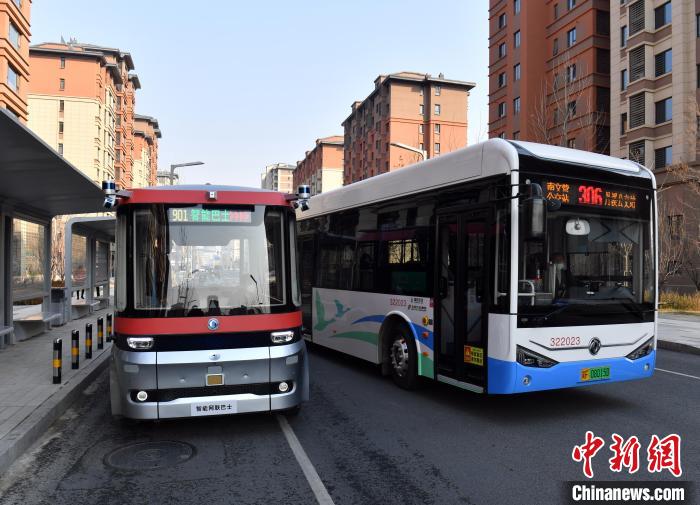 2023年2月22日,雄安新区的智能网联巴士901线测试车辆与普通城市公交车驶出公交站台。 中新社记者 韩冰 摄