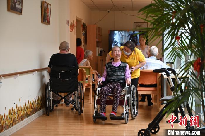 2023年4月11日,内蒙古呼和浩特市仕奇居家社区养老服务综合体内,护工与老人交流。 中新社记者 刘文华 摄