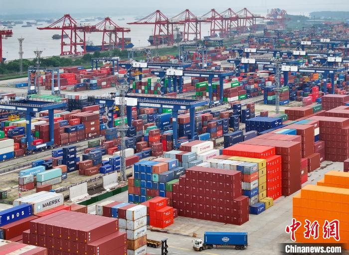 7月12日,航拍江苏南京龙潭港进出口集装箱码头。当日,中国海关总署公布的最新数据显示,上半年,中国货物贸易进出口总值21.17万亿元人民币,同比增长6.1%。(无人机照片) 中新社记者 泱波 摄