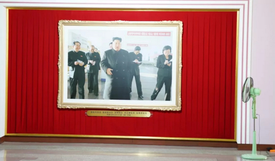 在这座三层楼高的厂房每层车间里都有一个标准而又特别的布置:每层车间的正面墙上都挂有一幅在许多场所可见的巨幅朝鲜现任领导人金正恩视察工作的油画,而在画像的右侧都放着一台立式的电风扇:习习的凉风吹拂着画像为它消暑解凉。