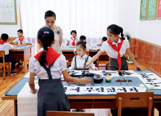 在万景台少年宫的影廊上挂着一幅幅学生才艺活动的照片,其中有一幅格外显眼:朝鲜领导人金正恩俯身站在一位满脸稚气,仅高出练习书法的书案一个头的小姑娘旁,神情专注地看着她握豪习字。