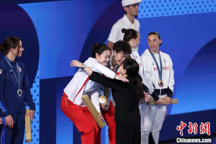 7月27日,在巴黎奥运会跳水女子双人3米板决赛中,中国选手昌雅妮/陈艺文夺得金牌。颁奖典礼上,世界泳联副主席周继红拥抱昌雅妮(左二)/陈艺文。中新社记者 富田 摄