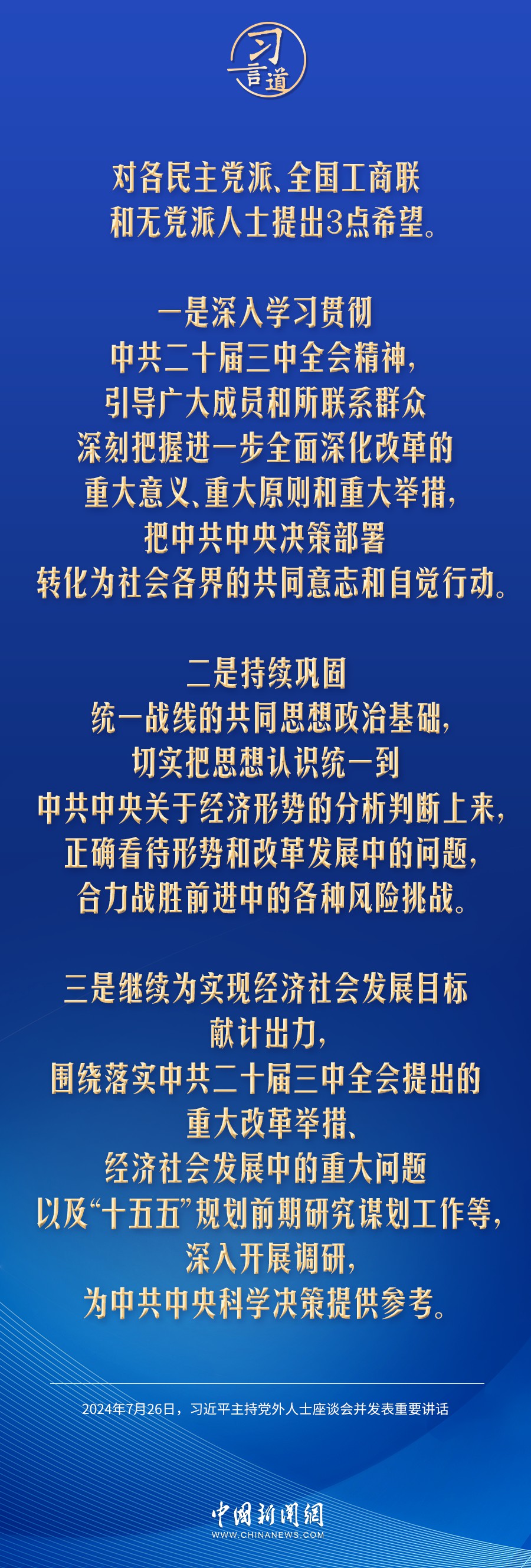 7月26日,中共中央在中南海召开党外人士座谈会,就当前经济形势和下半年经济工作听取各民主党派中央、全国工商联负责人和无党派人士代表的意见和建议。中共中央总书记习近平主持座谈会并发表重要讲话强调——