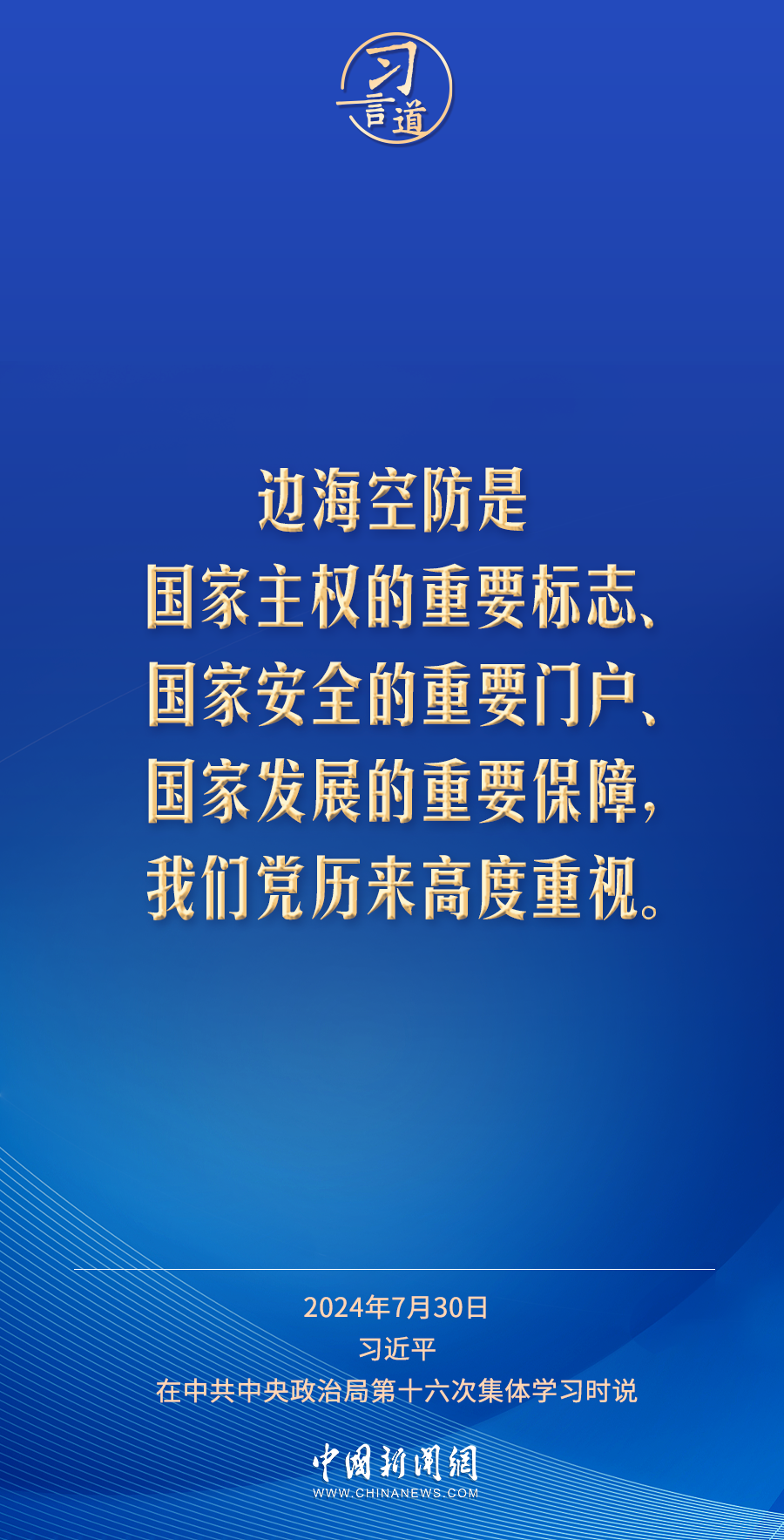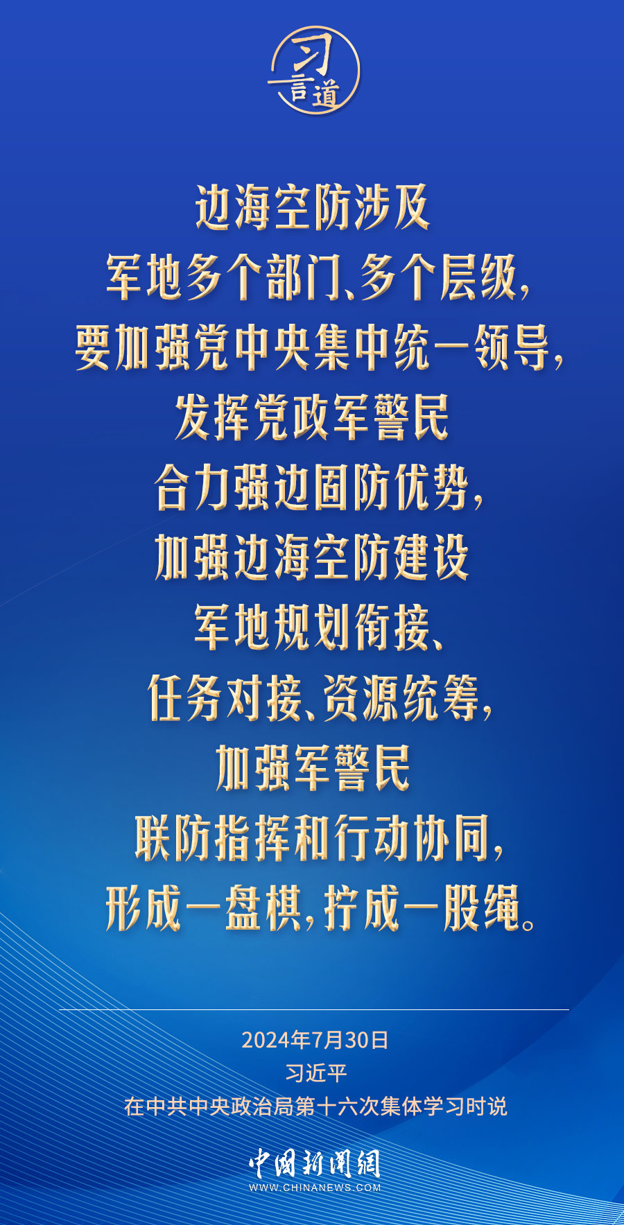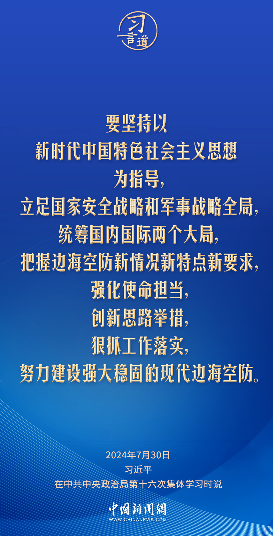 中共中央政治局7月30日就推进现代边海空防建设进行第十六次集体学习。中共中央总书记习近平在主持学习时发表重要讲话强调——