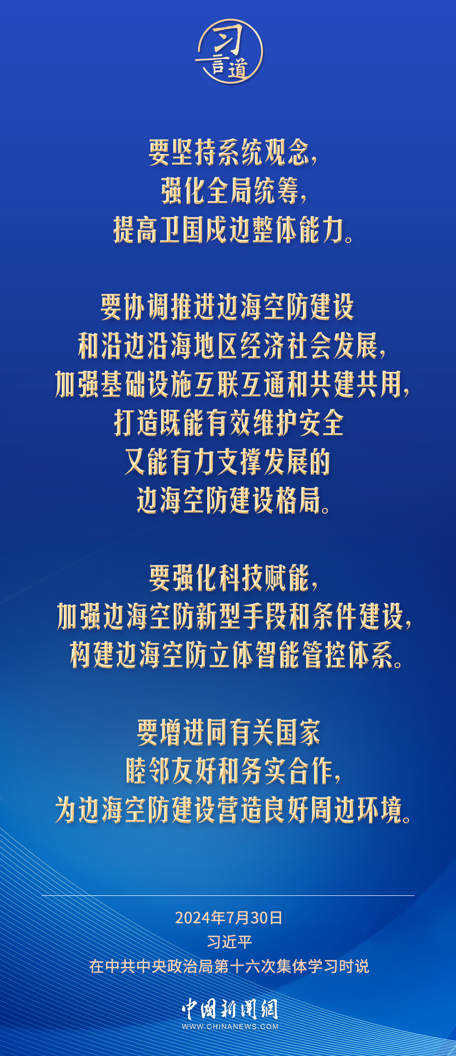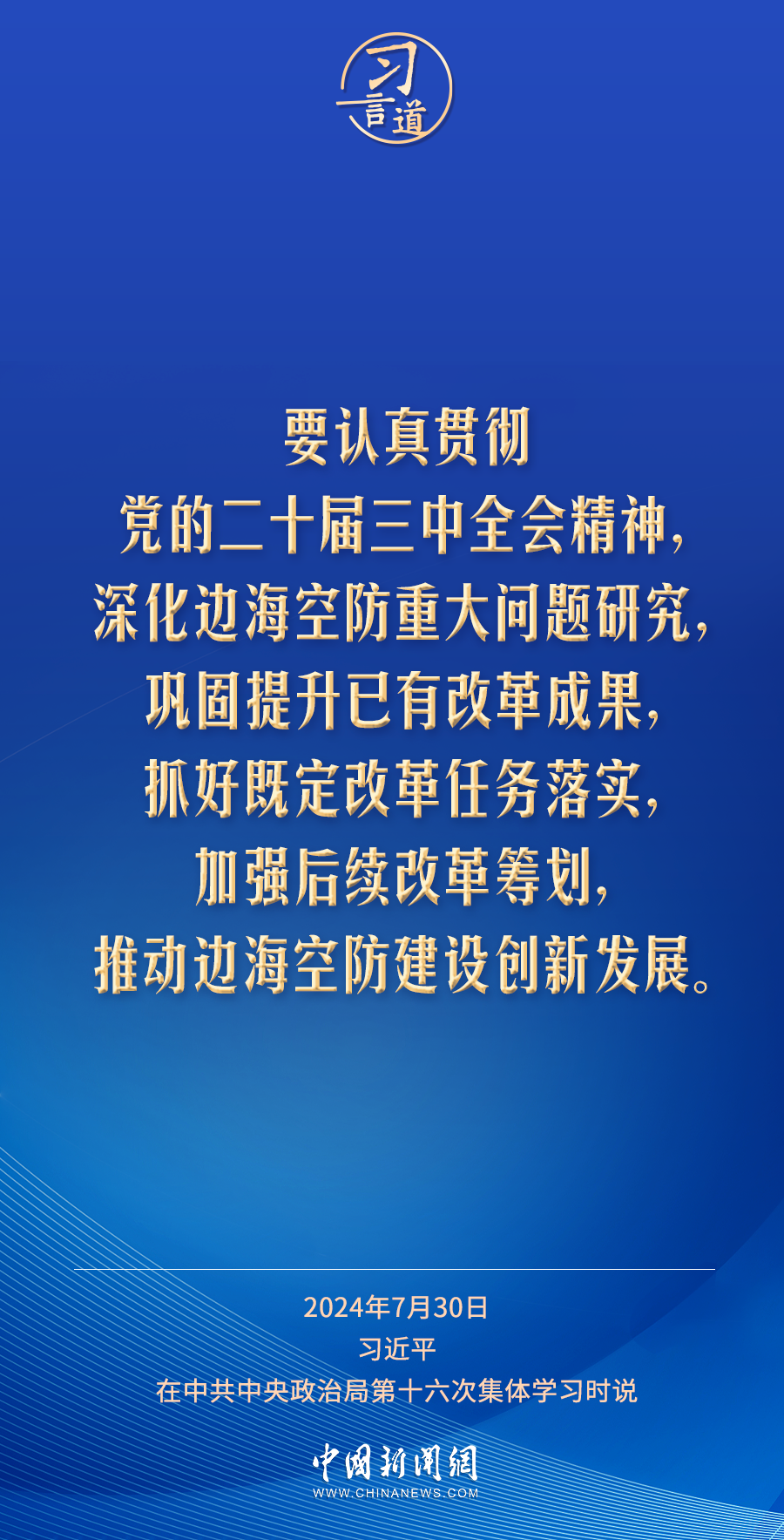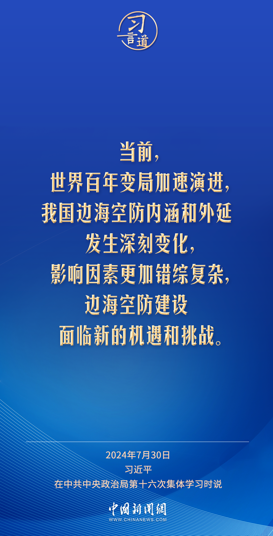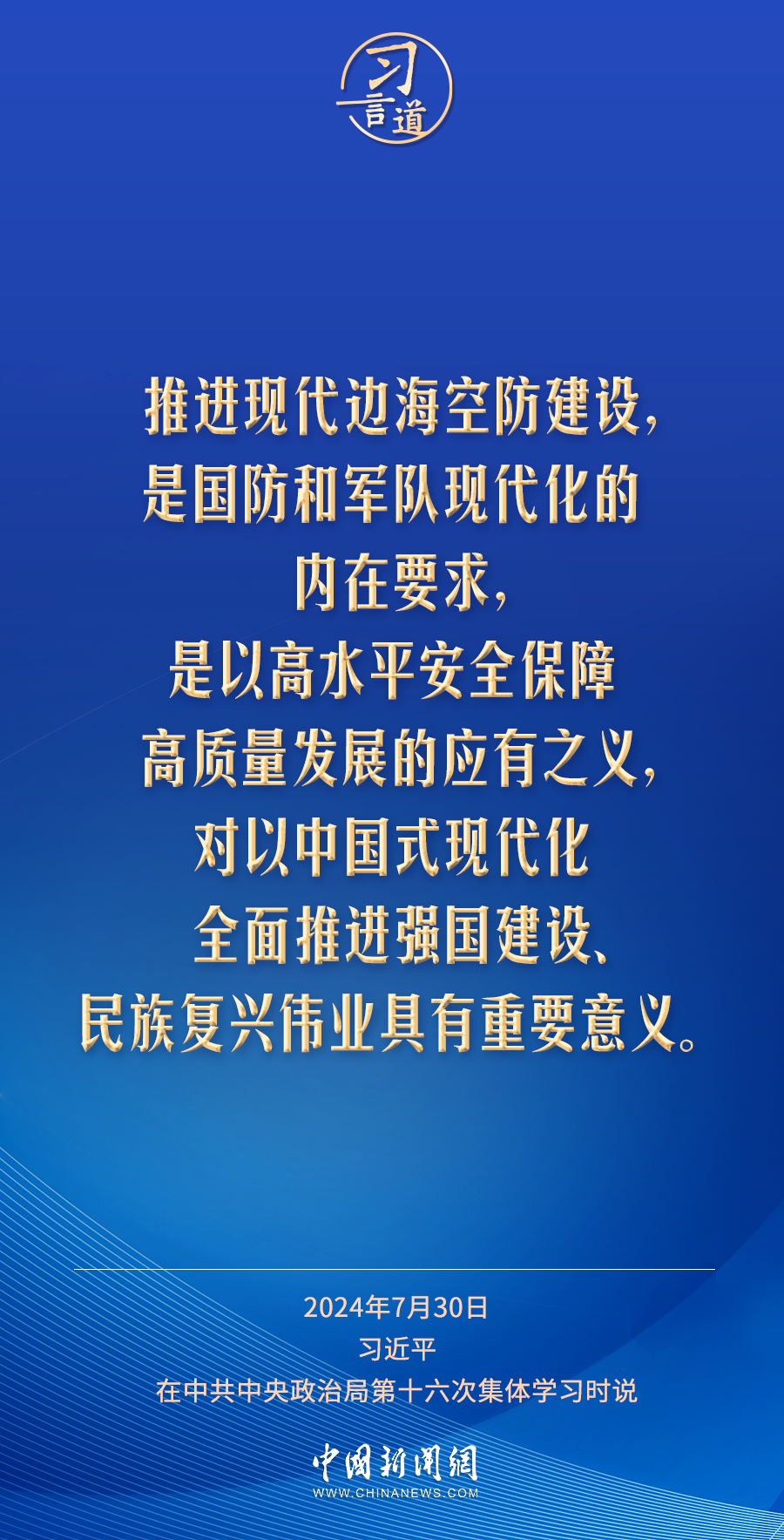 中共中央政治局7月30日就推进现代边海空防建设进行第十六次集体学习。中共中央总书记习近平在主持学习时发表重要讲话强调——