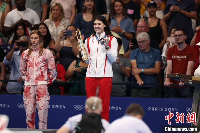张雨霏领取奖牌。中新社记者 富田 摄