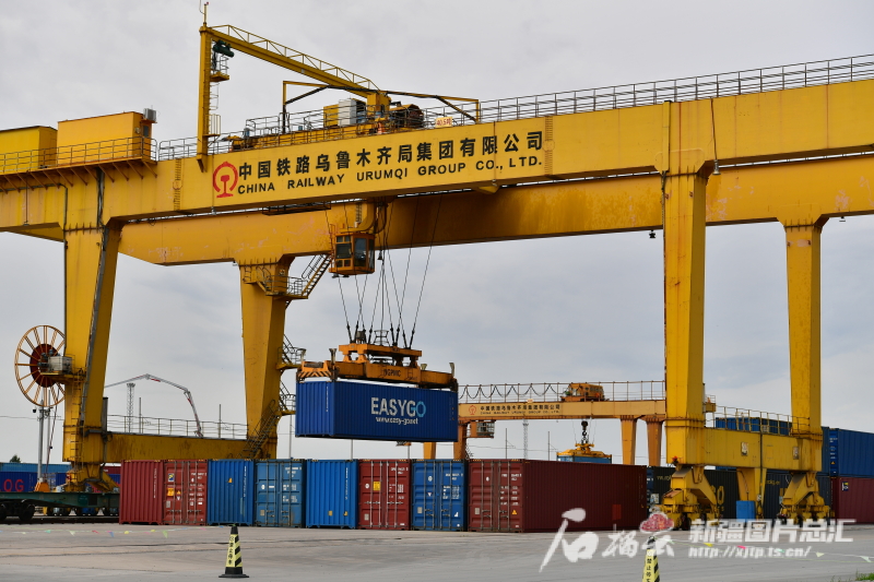 5月29日,霍尔果斯站内,工作人员操作龙门吊车在吊装集装箱。关拥军摄
