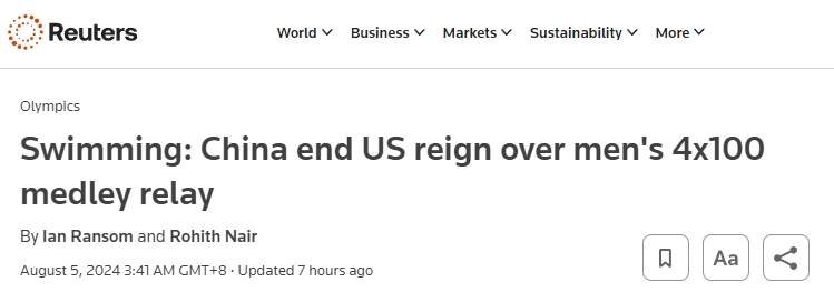 当地时间8月4日,在游泳男子4×100米混合泳接力中,中国队反超该项目的奥运“霸主”美国队以及东道主法国队,以3分27秒46夺冠。英国路透社(Reuters)4日的报道中写道,现场欢呼声震耳欲聋,中国队的夺冠结束了美国队64年来的不败纪录。赛后,美国选手莱恩·墨菲(Ryan Murphy)说:“今天中国队的表现比我们要更好一些,向中国队致敬,他们今晚的表现非常出色。”另一名美国选手亨特·阿姆斯特朗(Hunter Armstrong)则关注到当天是中国选手潘展乐的生日,他表示:“这对他来说会是一份很酷的生日礼物!”