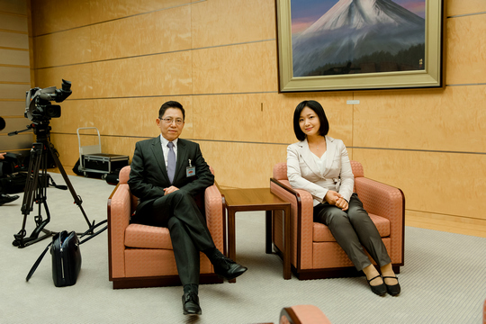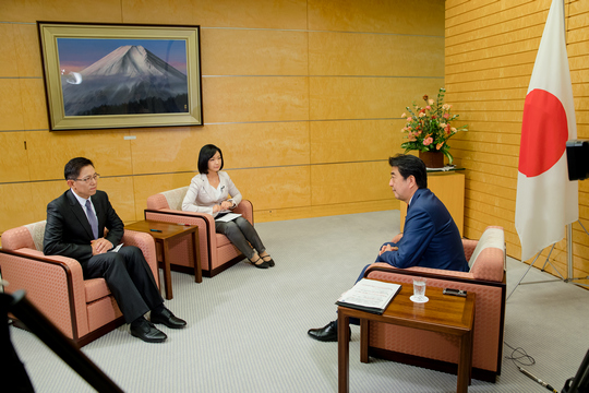 安倍在首相官邸接受鳳凰衛視資訊台執行總編輯呂寧思和鳳凰衛視駐東京首席記者李淼的獨家專訪