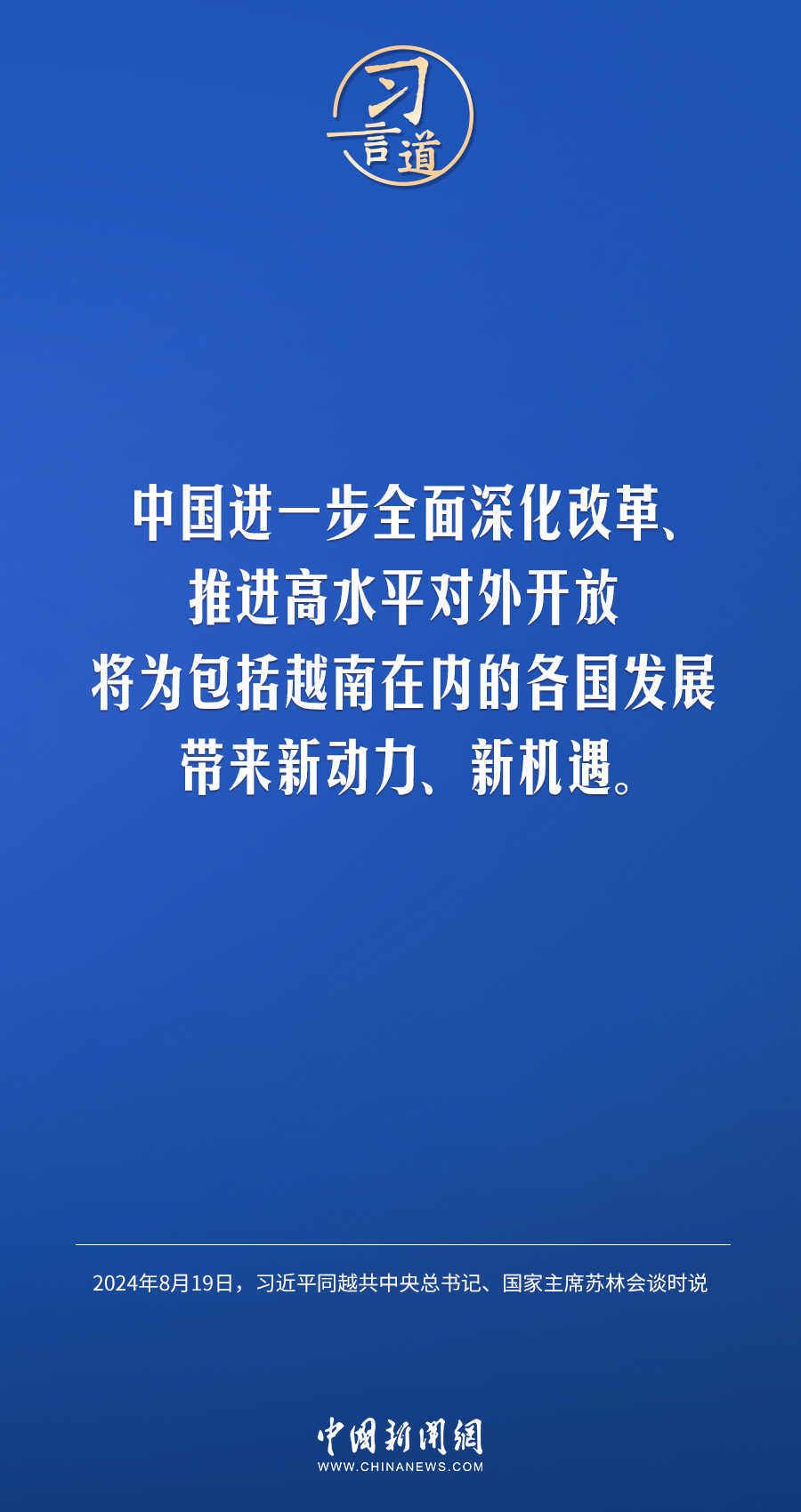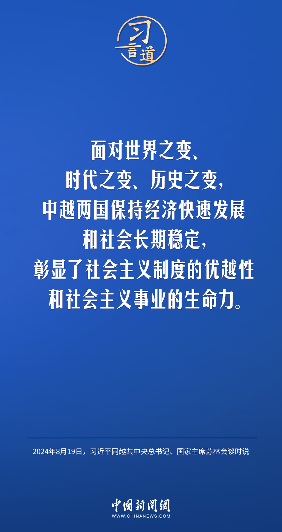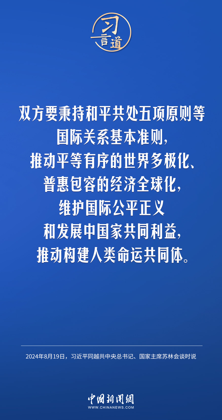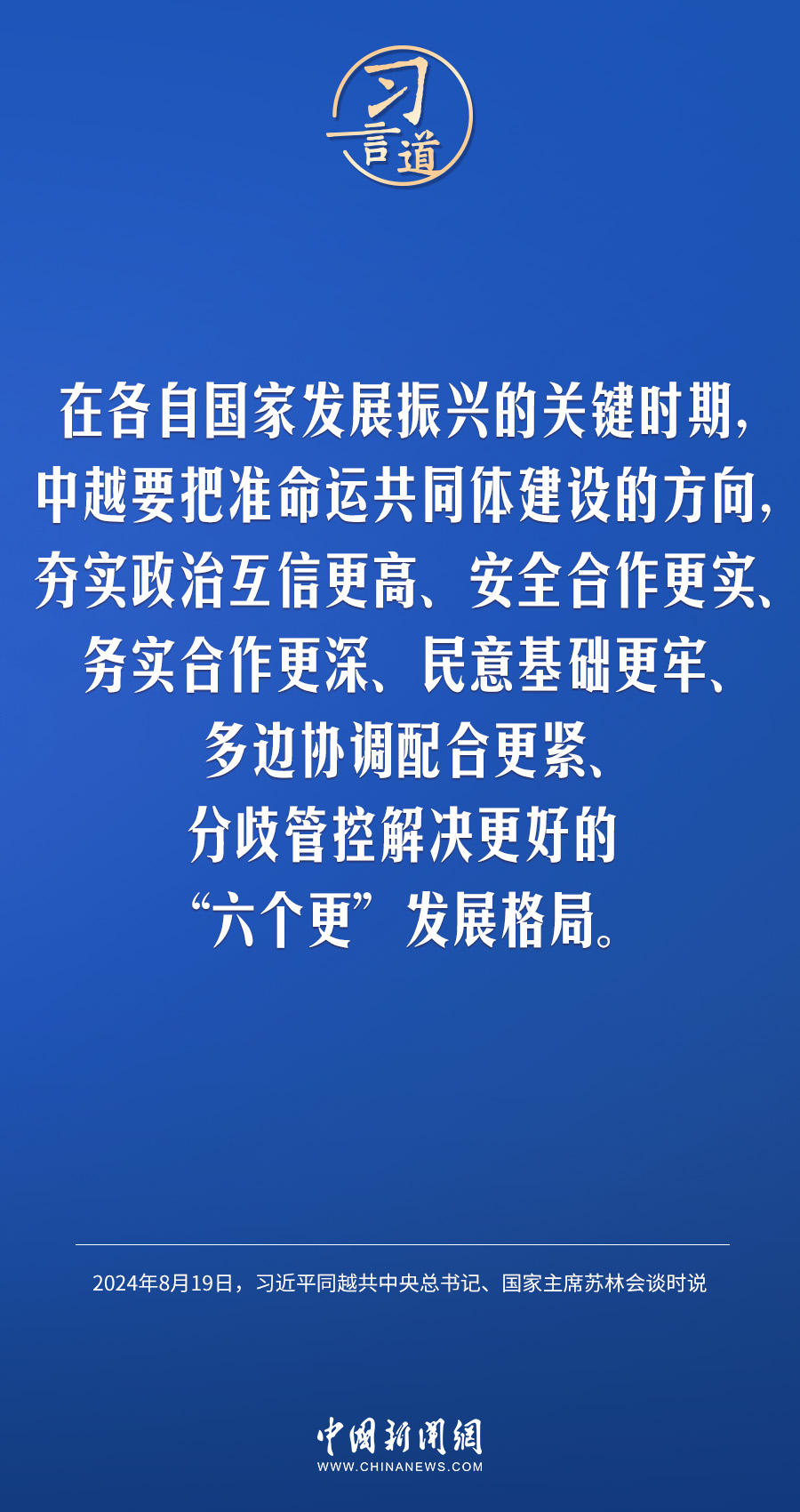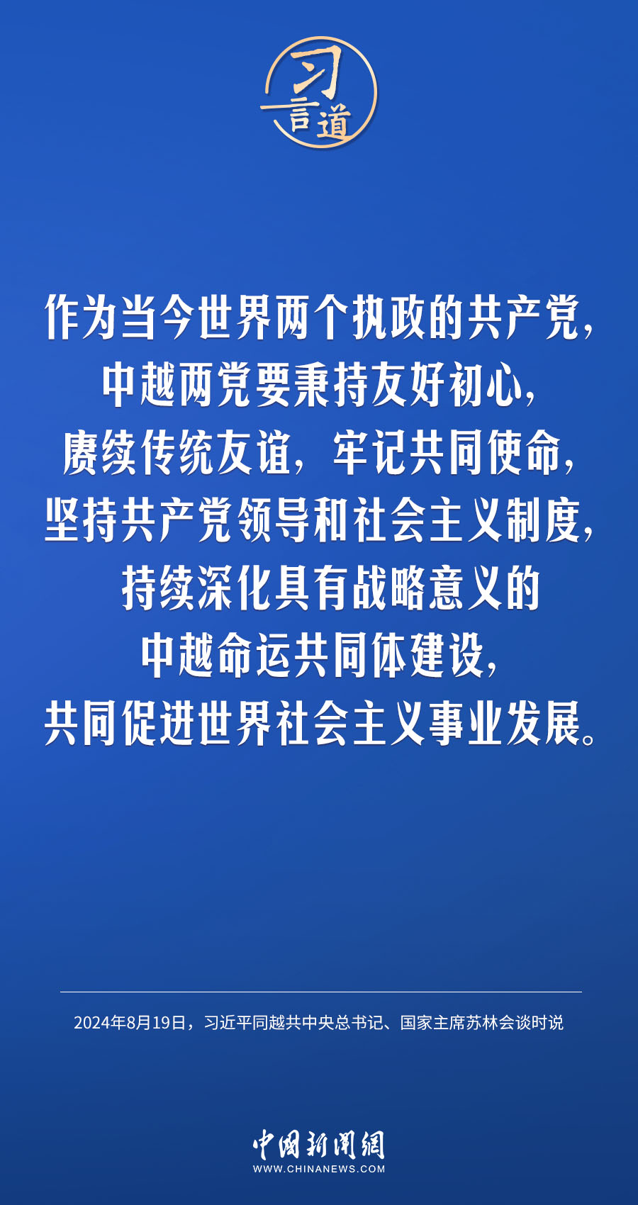 8月19日,中共中央总书记、国家主席习近平在北京人民大会堂同来华进行国事访问的越共中央总书记、国家主席苏林举行会谈。习近平指出——