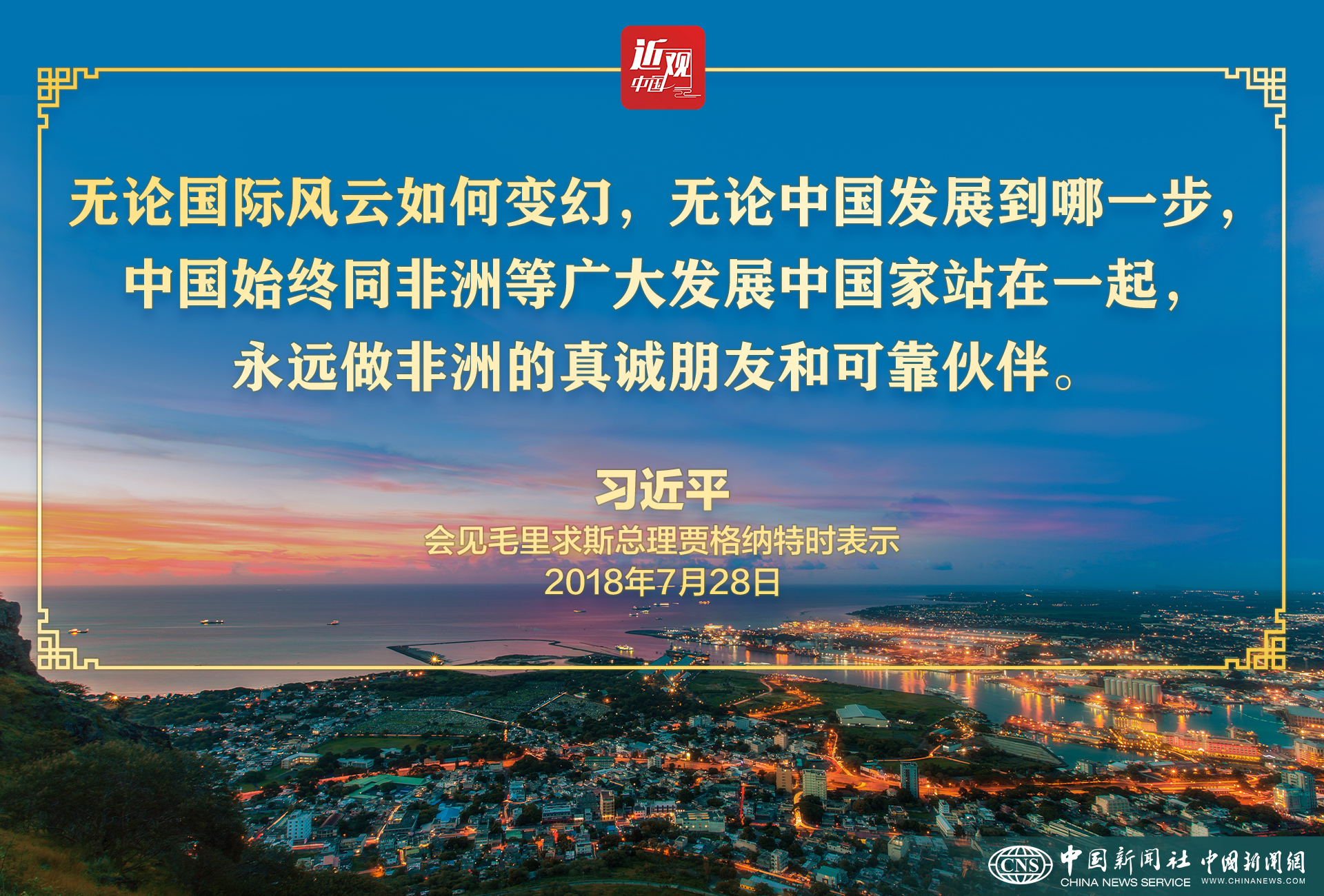 2018年7月28日,国家主席习近平在毛里求斯会见毛里求斯总理贾格纳特。习近平指出,中非是休戚与共的命运共同体和合作共赢的利益共同体。无论国际风云如何变幻,无论中国发展到哪一步,中国始终同非洲等广大发展中国家站在一起,永远做非洲的真诚朋友和可靠伙伴。
