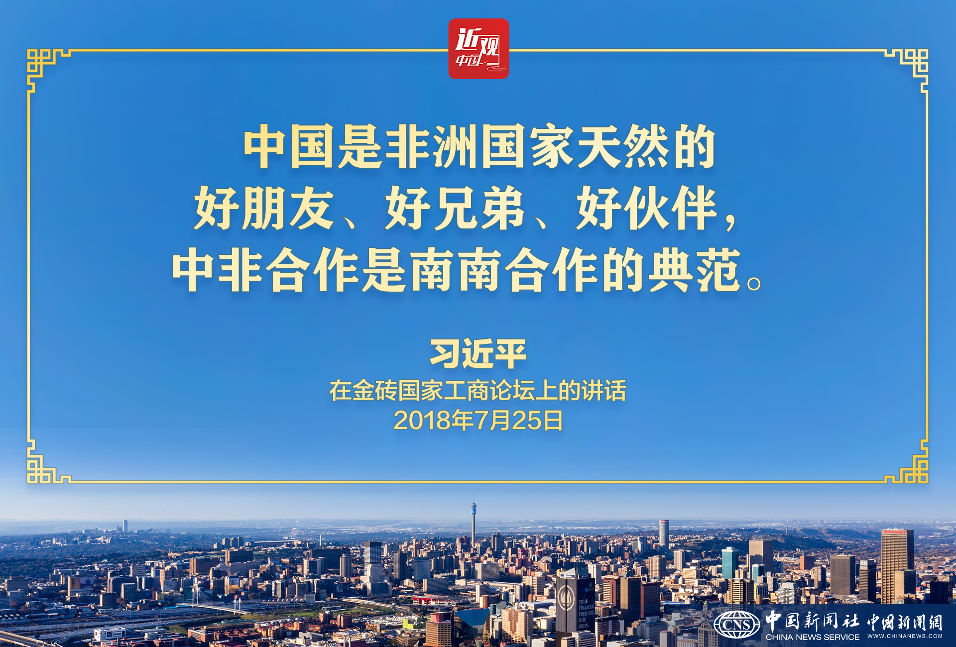 2018年7月25日,国家主席习近平应邀出席在南非约翰内斯堡举行的金砖国家工商论坛,并发表题为《顺应时代潮流 实现共同发展》的重要讲话,强调金砖国家要顺应历史大势,坚持合作共赢、创新引领、包容普惠、多边主义,为构建新型国际关系、构建人类命运共同体发挥建设性作用。习近平表示,中国是非洲国家天然的好朋友、好兄弟、好伙伴,中非合作是南南合作的典范。