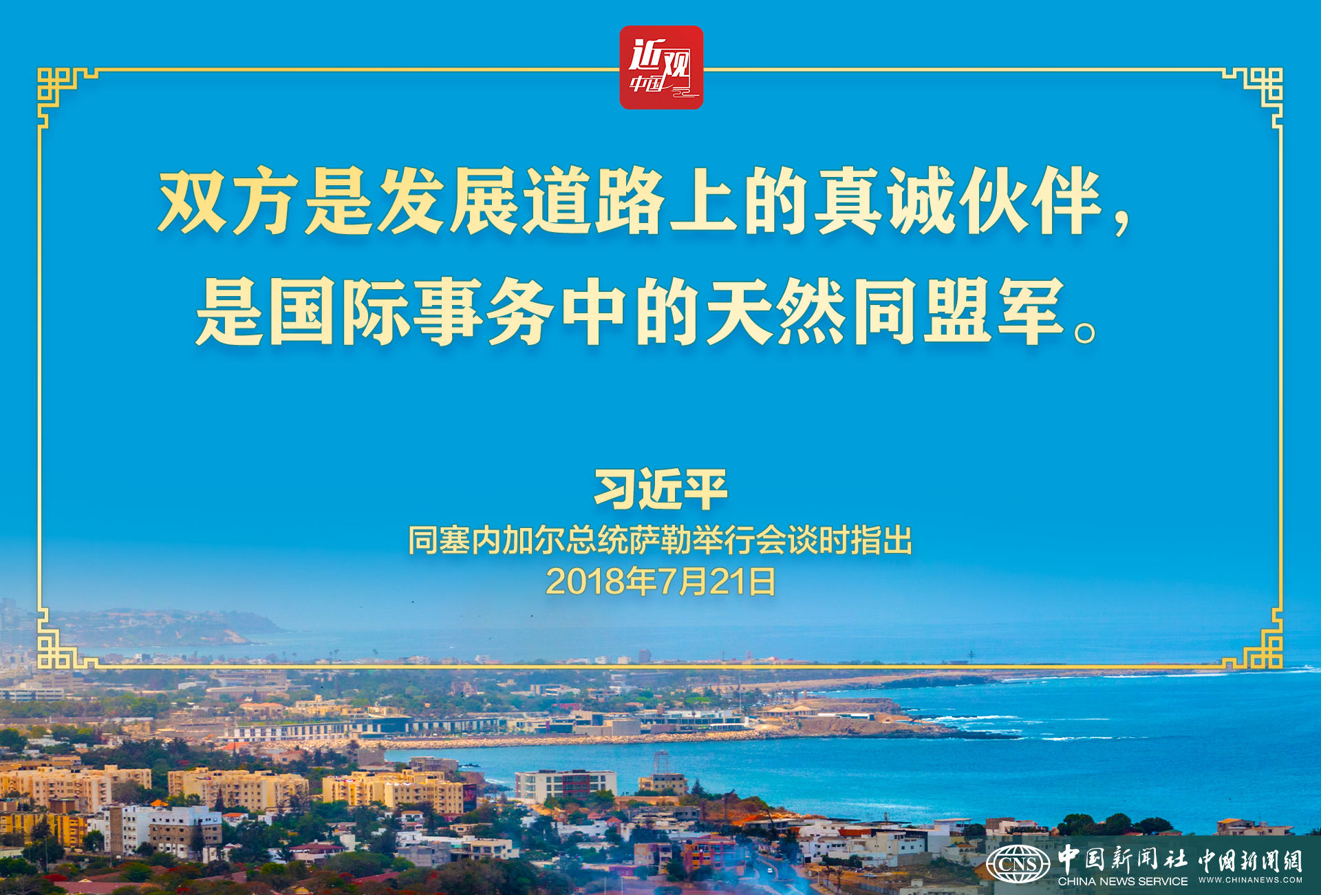 2018年7月21日,国家主席习近平在达喀尔同塞内加尔总统萨勒举行会谈。习近平指出,我高度重视中非关系,我深深感到,中非长期友好,命运休戚与共。双方是发展道路上的真诚伙伴,是国际事务中的天然同盟军。中国的发展将给非洲带来更多机遇,非洲的发展也将为中国发展增添动力。