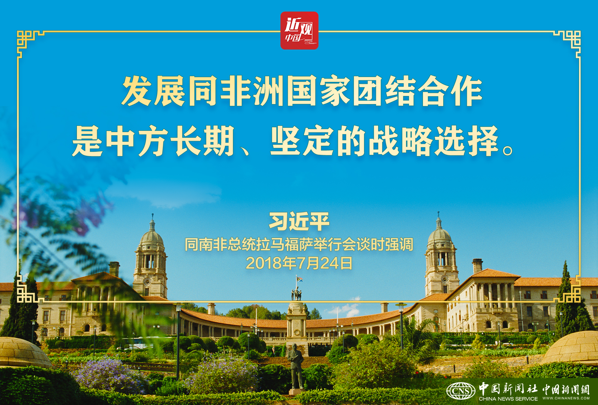 2018年7月24日,国家主席习近平在比勒陀利亚同南非总统拉马福萨举行会谈。两国元首高度评价中南传统友好,就推进新时期中南全面战略伙伴关系达成重要共识,一致同意加强高层往来,深化政治互信,对接发展战略,推进务实合作,密切人文交流,让两国人民更多享受中南合作成果。习近平强调,发展同非洲国家团结合作是中方长期、坚定的战略选择。