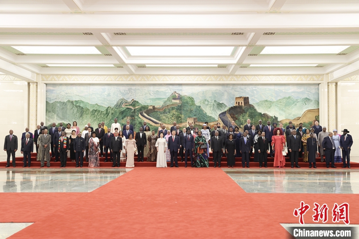 9月4日晚,中国国家主席习近平和夫人彭丽媛在北京人民大会堂举行宴会,欢迎来华出席中非合作论坛北京峰会的非方及国际贵宾并集体合影留念。中新社记者 盛佳鹏 摄