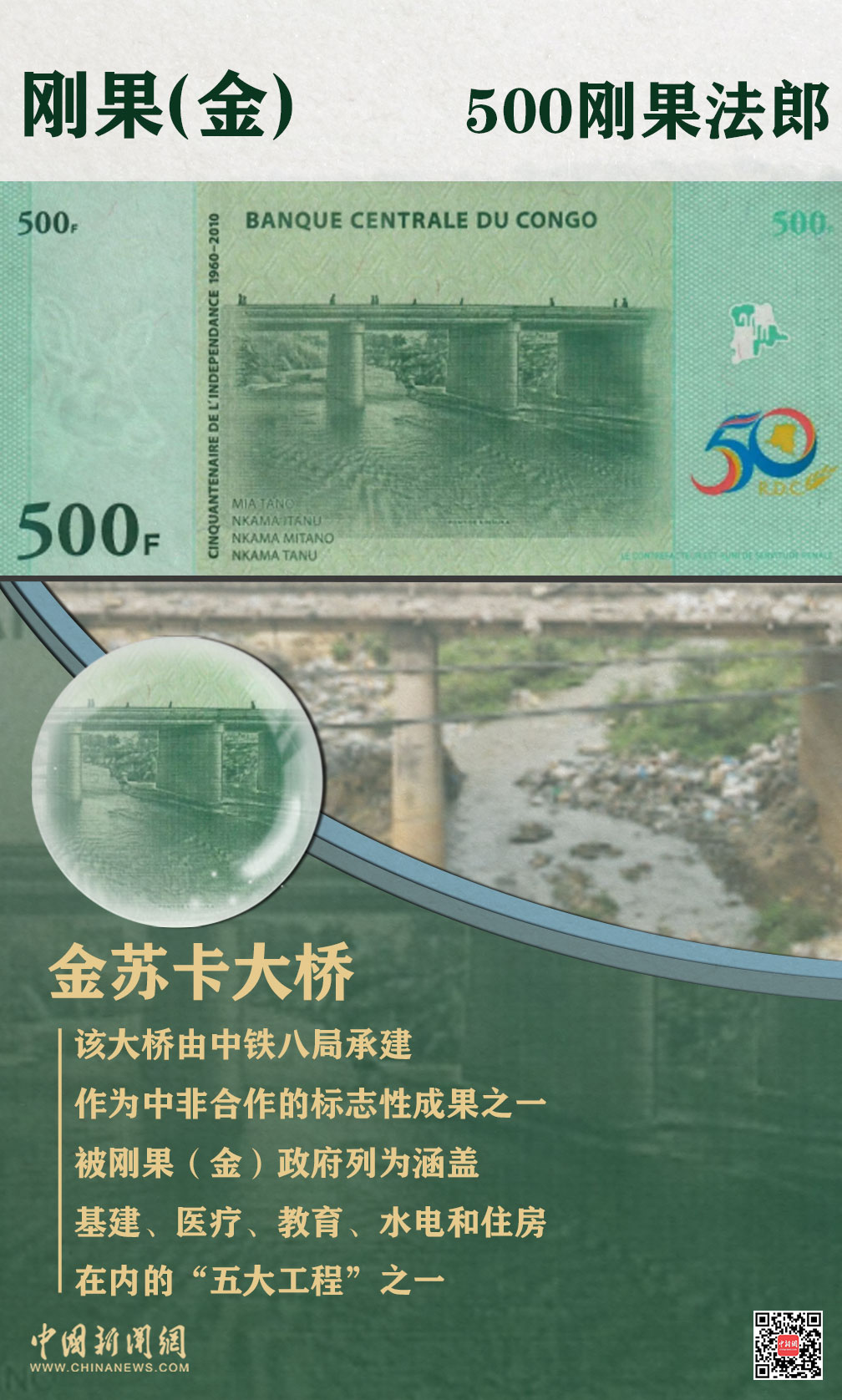 此外,由中铁八局承建的金苏卡大桥印制在刚果(金)国家独立50周年纪念币上,作为中非合作的标志性成果之一,被刚果(金)政府列为涵盖基建、医疗、教育、水电和住房在内的“五大工程”之一。