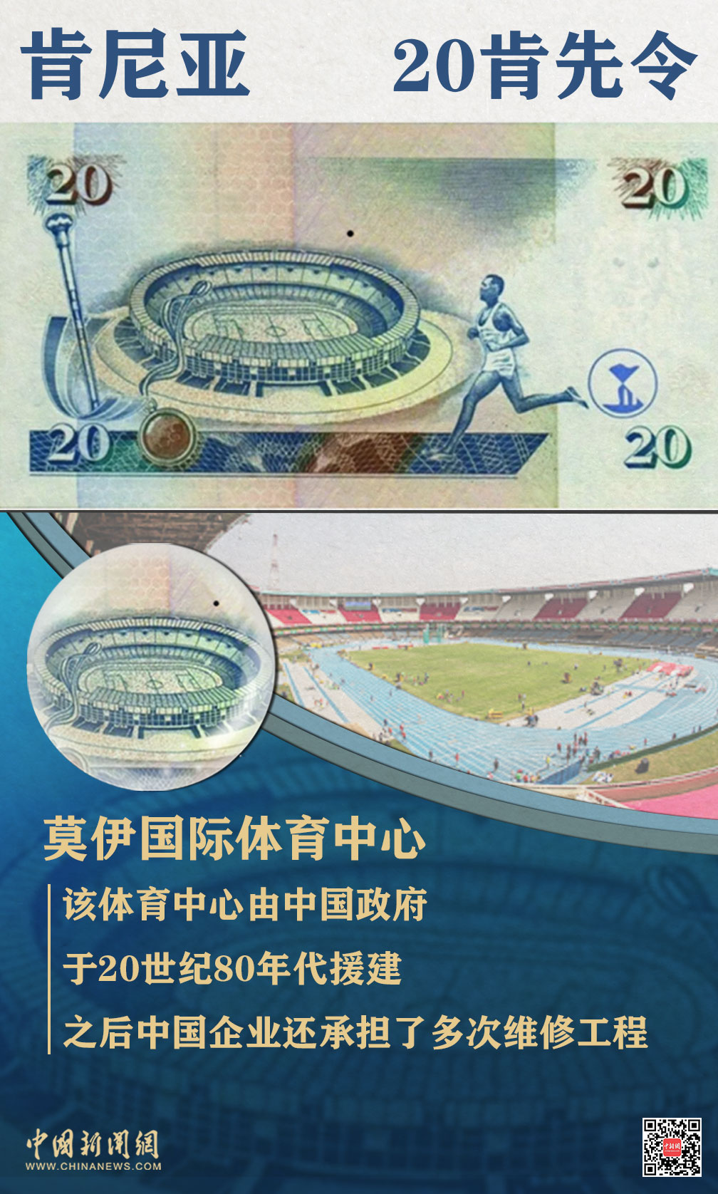 肯尼亚的20肯先令纸币上的莫伊国际体育中心是中国和肯尼亚友谊的丰碑,时至今日仍是全非洲最大最好的体育场馆之一。该体育中心由中国政府于上世纪80年代援建,之后中国企业还承担了多次维修工程。