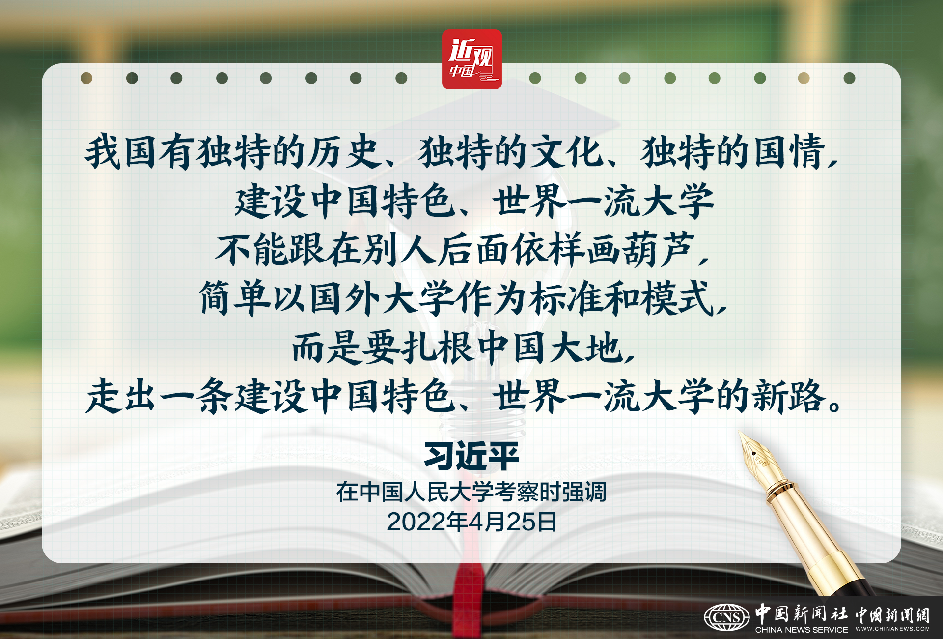 习近平强调,我国有独特的历史、独特的文化、独特的国情,建设中国特色、世界一流大学不能跟在别人后面依样画葫芦,简单以国外大学作为标准和模式,而是要扎根中国大地,走出一条建设中国特色、世界一流大学的新路。