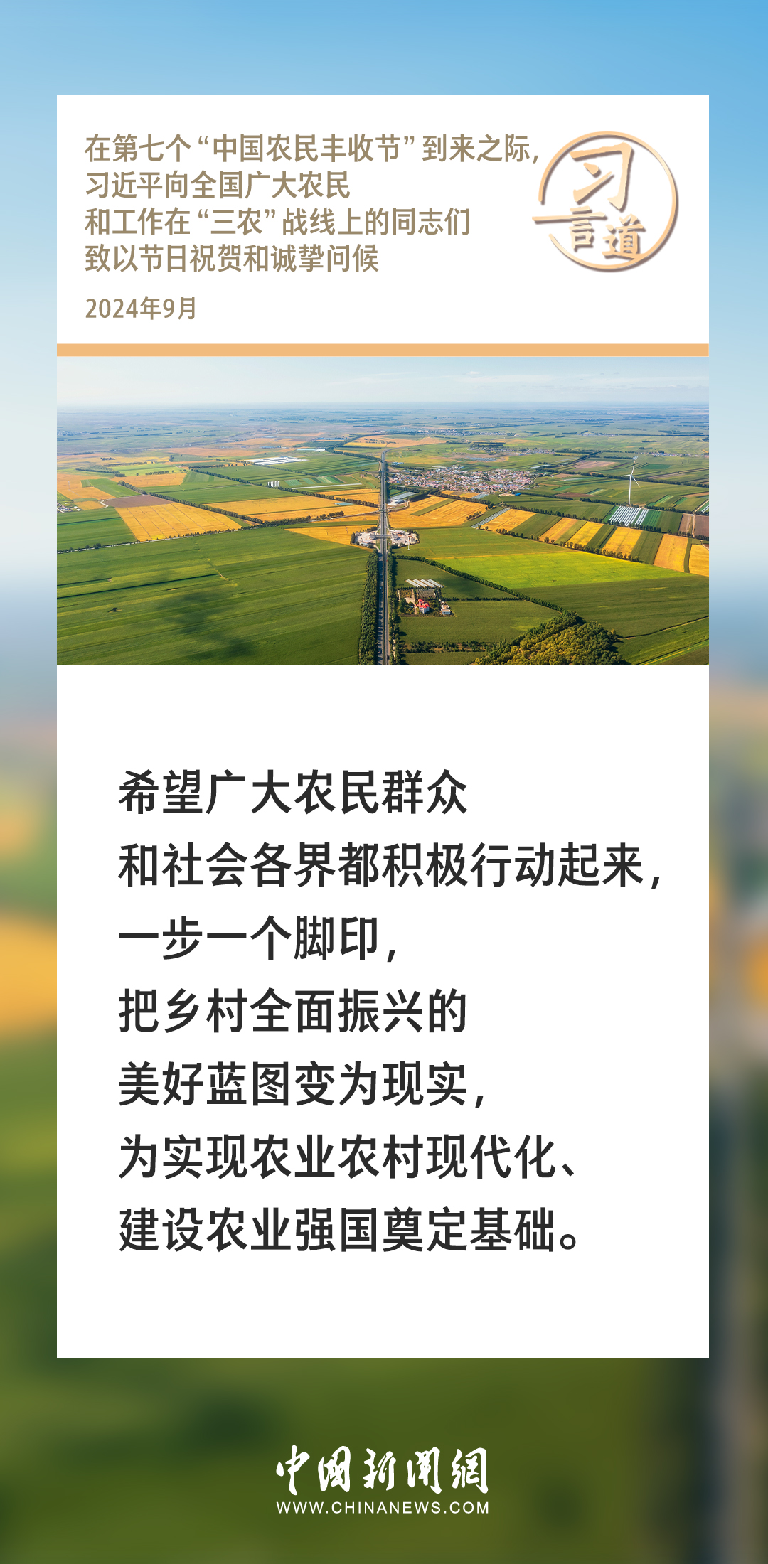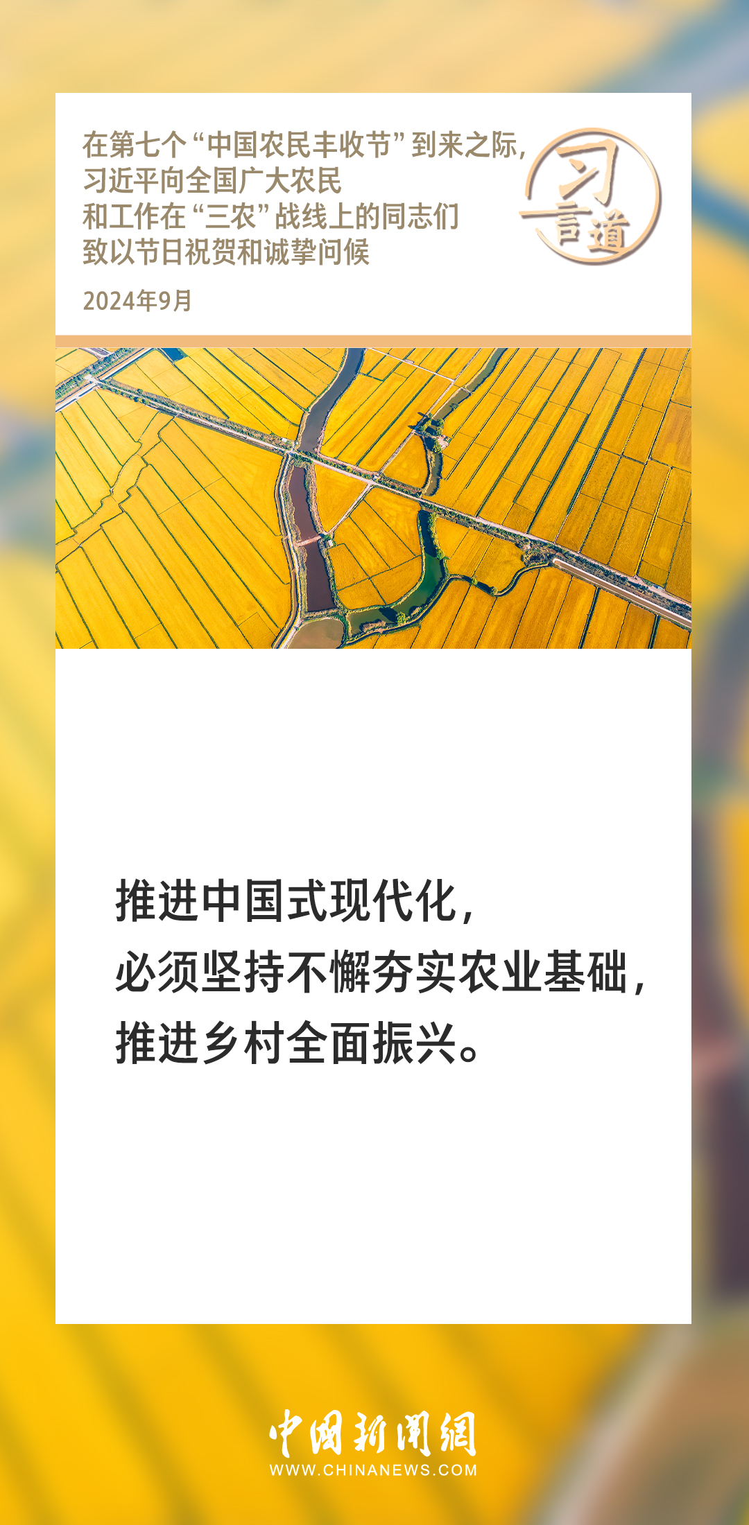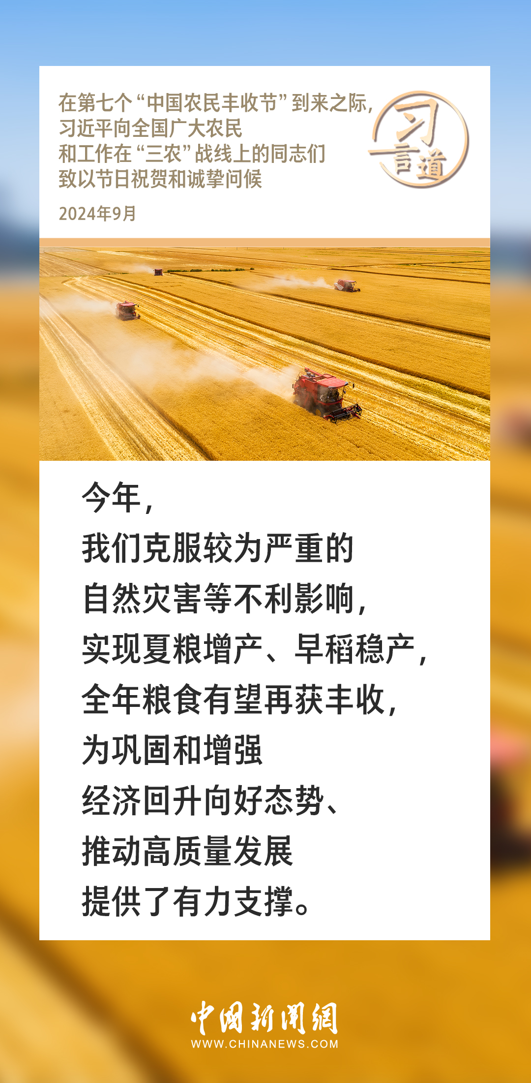 在第七个“中国农民丰收节”到来之际,中共中央总书记、国家主席、中央军委主席习近平代表党中央,向全国广大农民和工作在“三农”战线上的同志们致以节日祝贺和诚挚问候。习近平指出——