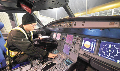 1月8日凌晨,安徽合肥新桥国际机场机务人员在飞机驾驶舱进行航前检查。 张大岗摄(人民视觉)